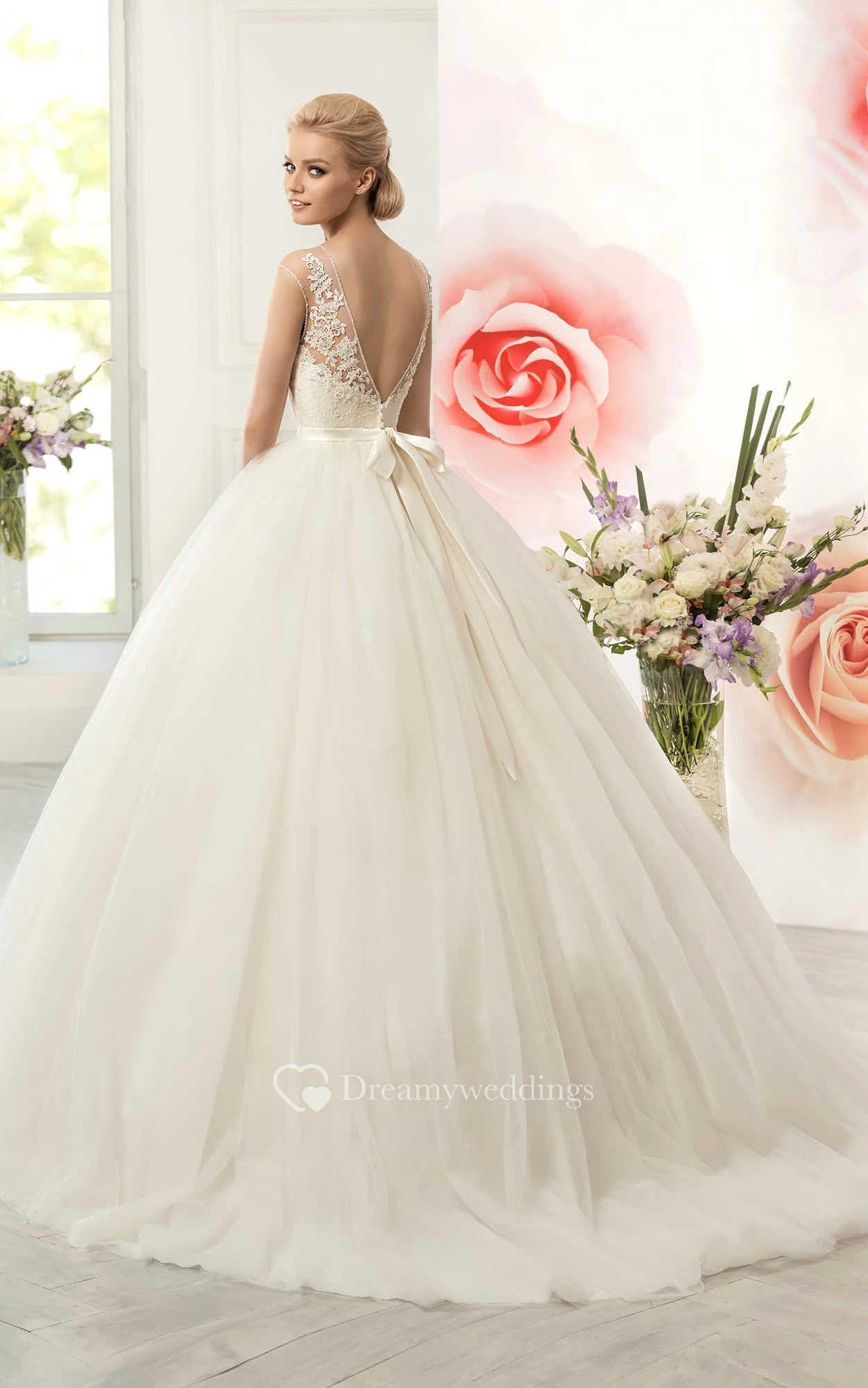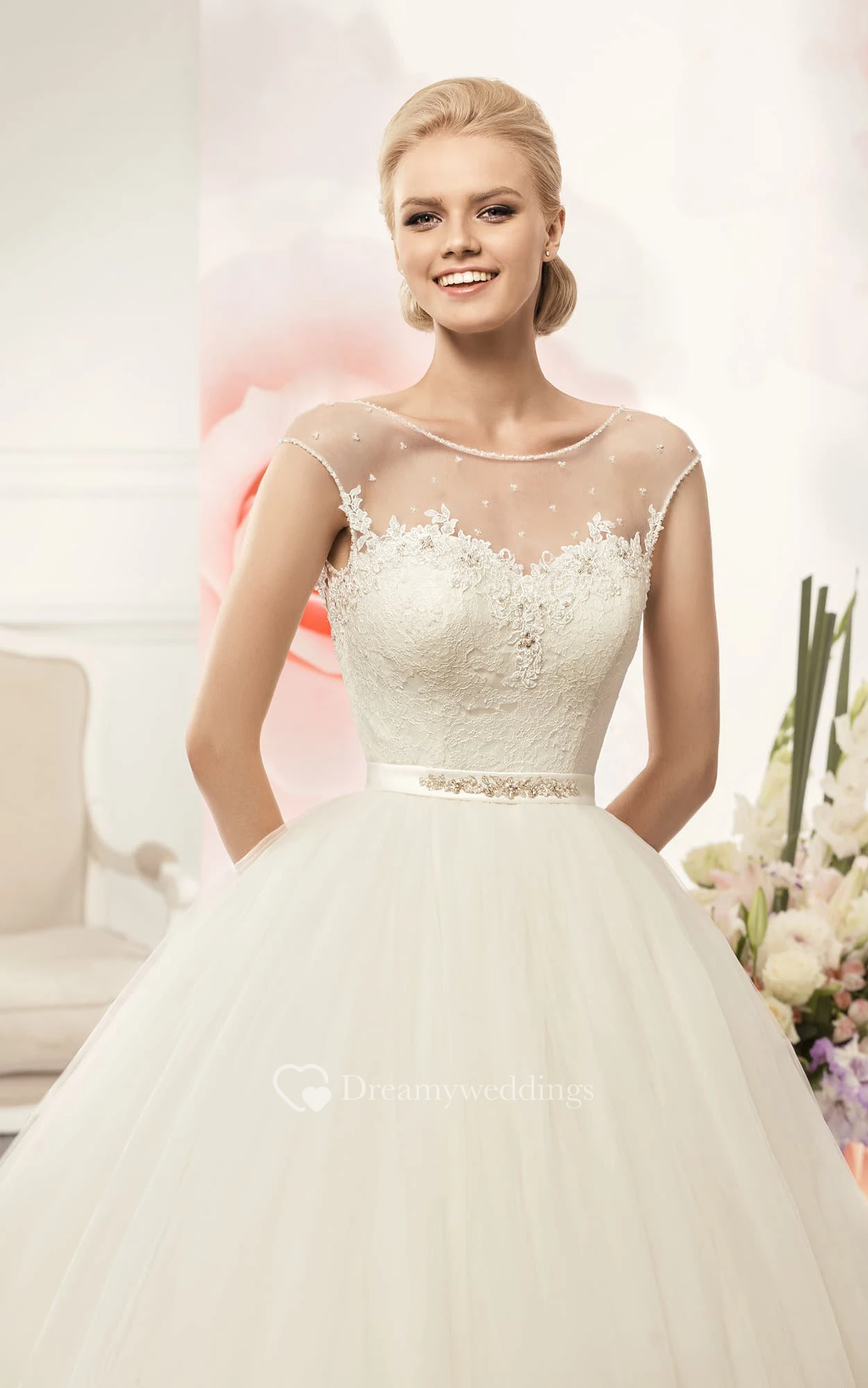 Ball Gown Long Scoop Cap-Sleeve Deep-V-Back Tulle Dress With Appliques And Waist Jewellery