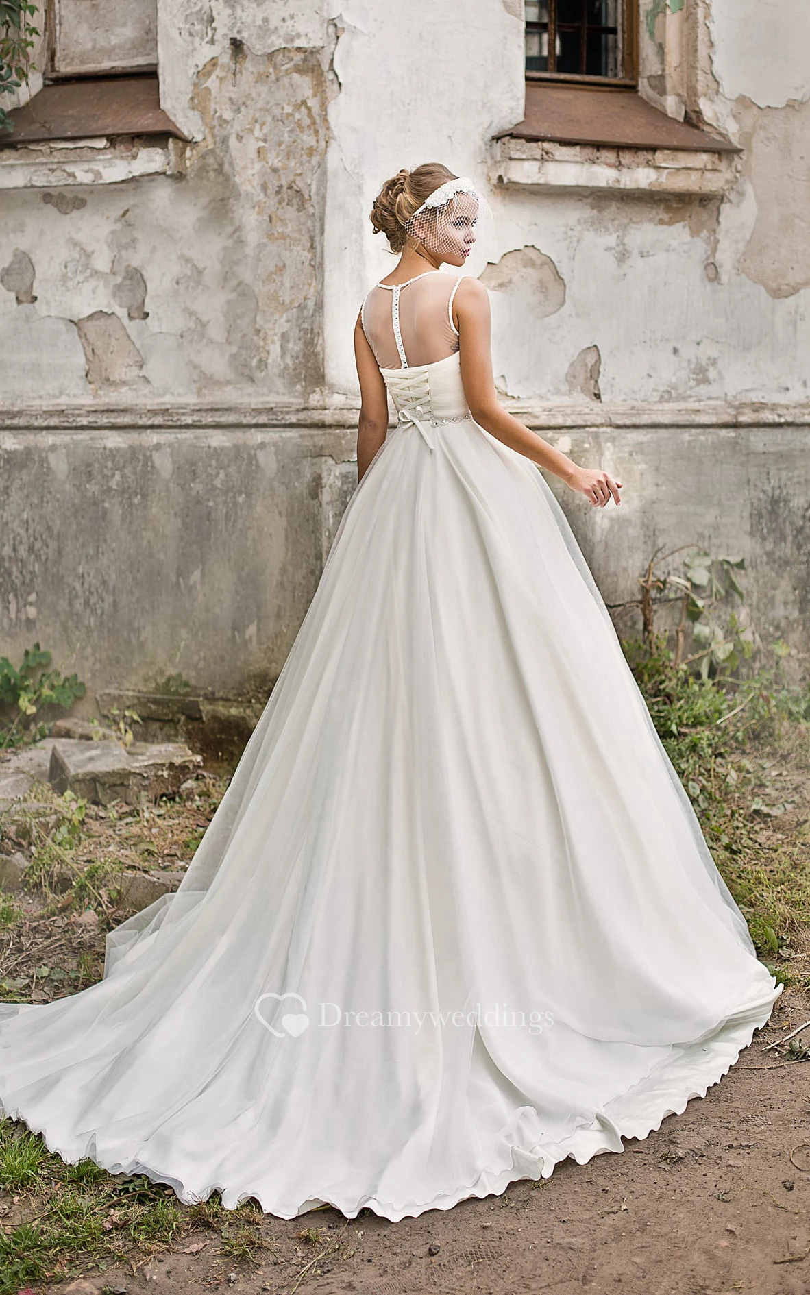Ball Gown Long Scoop Sleeveless Illusion Satin Dress With Ruching And Beading