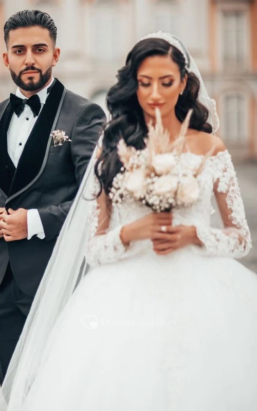 Ball Gown Long Sleeved Tulle Off-the-shoulder Wedding Dress with Appliques