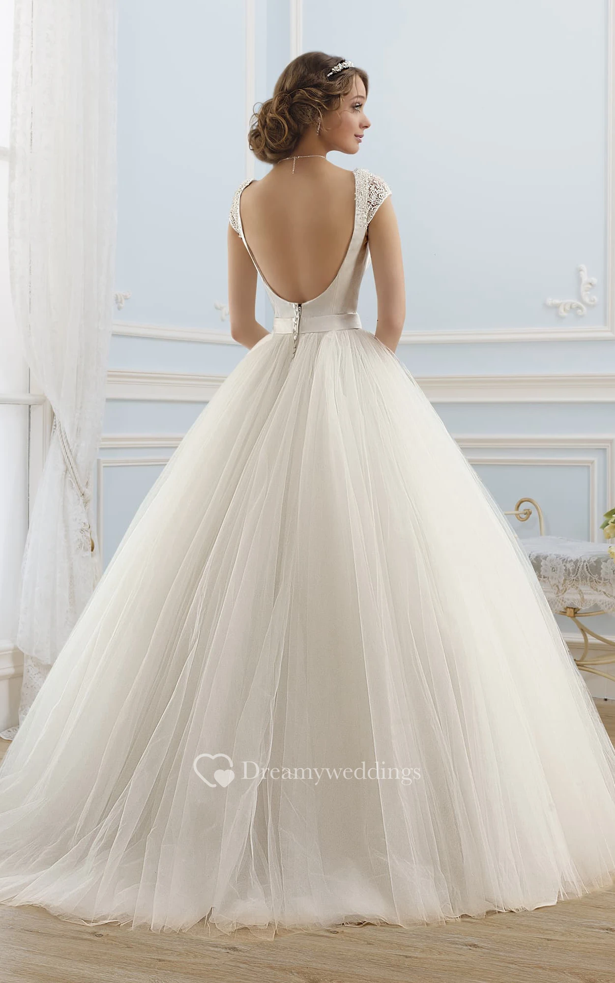 This is a beautiful ball gown wedding dress! The tulle fabric is gorgeous, it is well made, and it arrived so quickly. The back is very open, as pictured. I love the color. Very pretty. Well made. Shipped timely too.