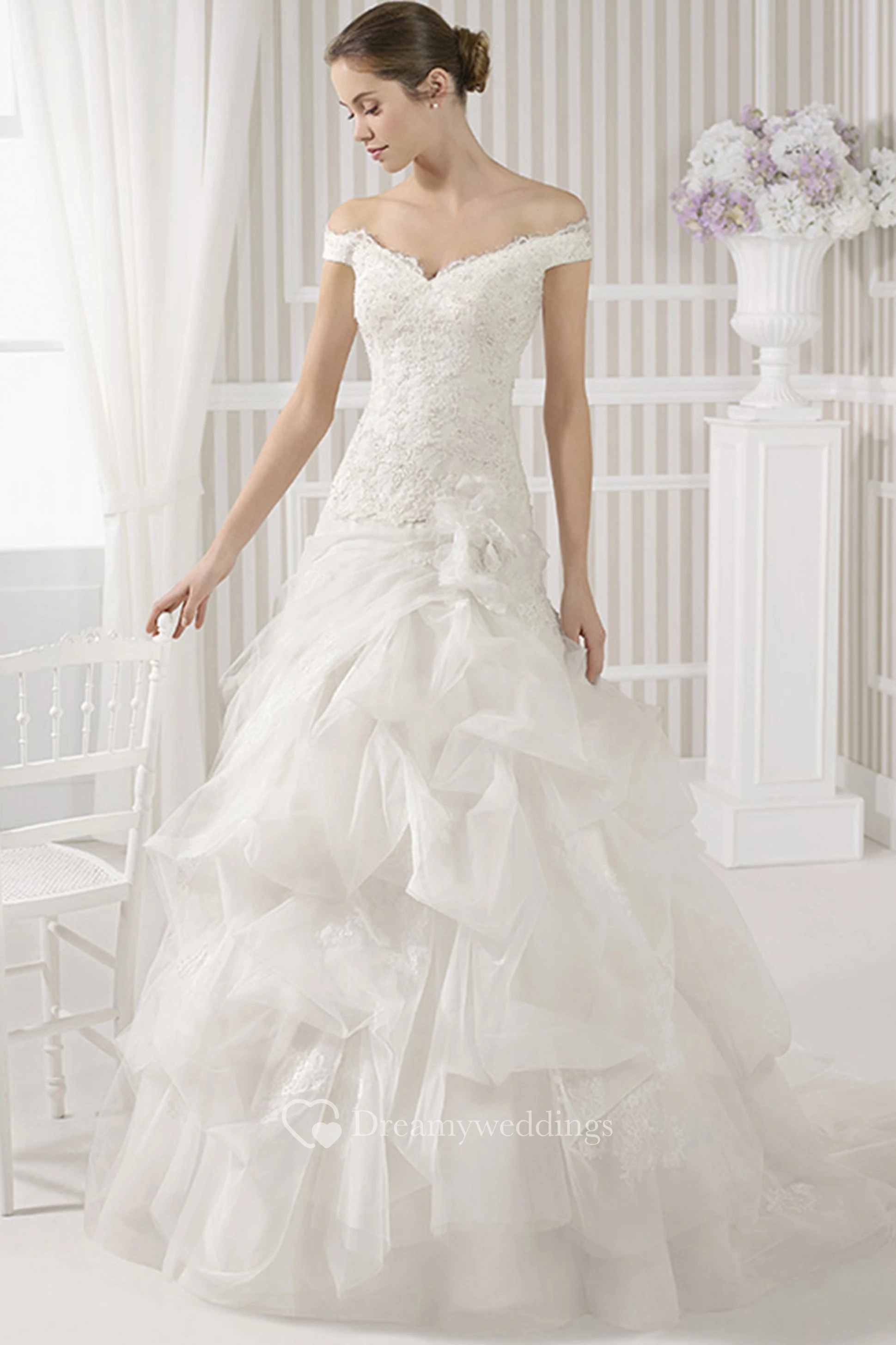 Ball Gown Maxi Off-The-Shoulder Appliqued Tulle Wedding Dress