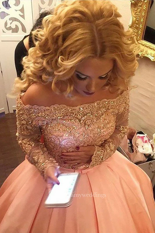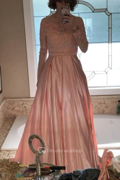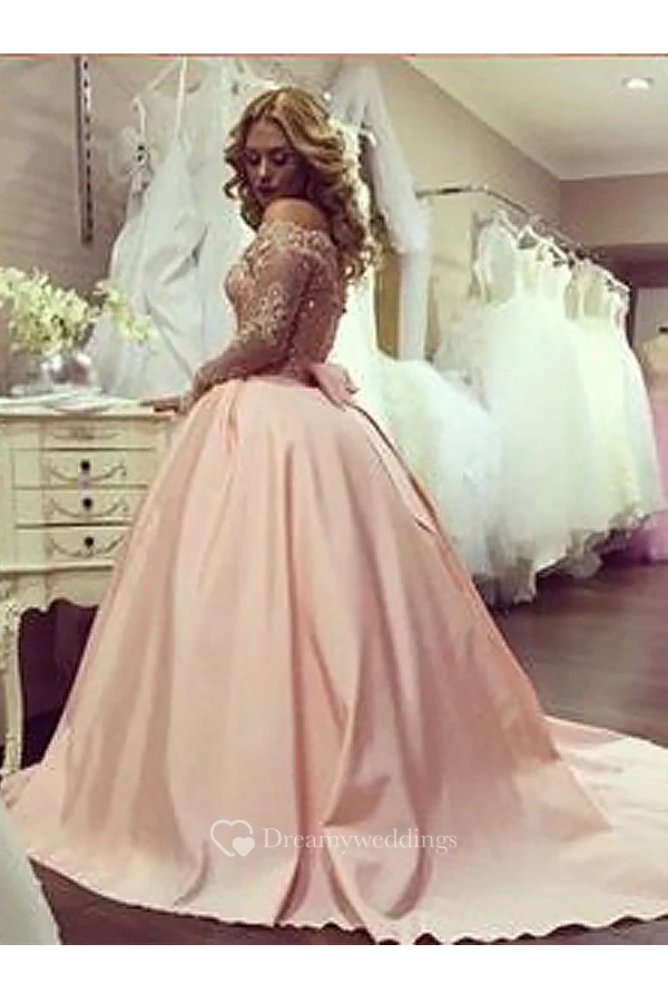 Ball Gown Satin Lace Off-the-shoulder Long Sleeve Zipper Dress
