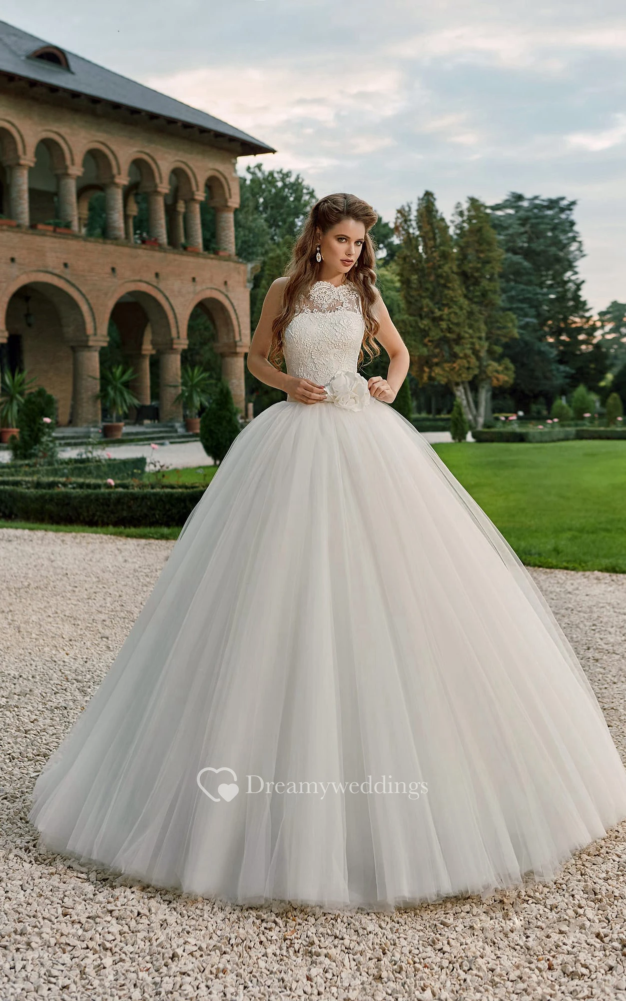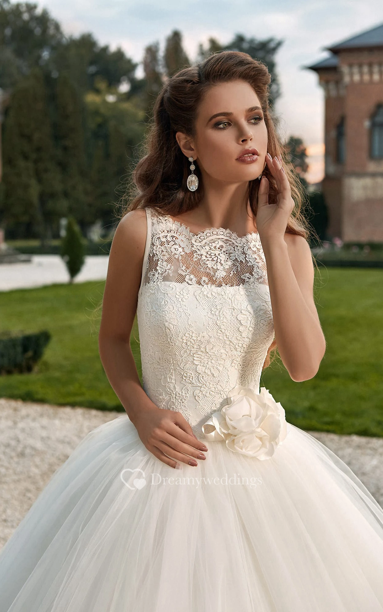 Ball Gown Scalloped Neckline Lace Top Tulle Dress With Flower