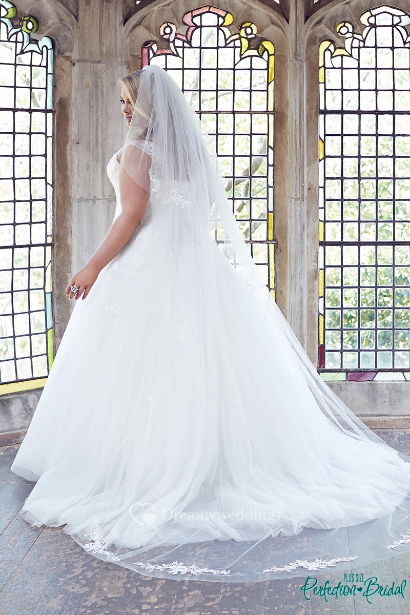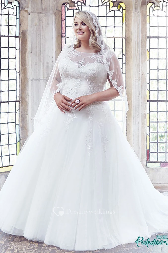 Ball Gown Scoop-Neck Sleeveless Long Tulle Plus Size Wedding Dress With Appliques And Brush Train
