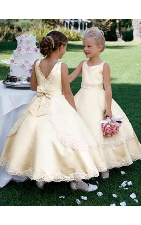 Ball Gown Scoop Sleeveless Bowknot Ankle-length Satin Flower Girl Dresses