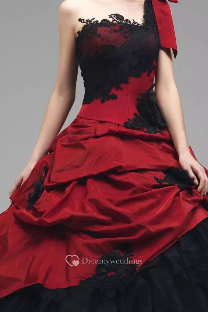 Ball Gown Taffeta Tulle One-shoulder Sleeveless Floor-length Wedding Dress with Appliques and Ruffles