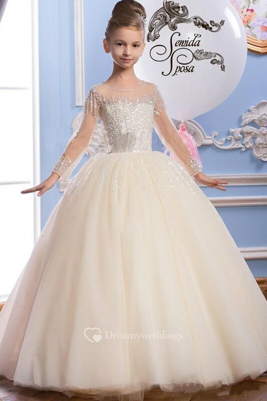 Ball Gown Tulle Scoop Illusion Sleeve Beading Flower Girl Dress