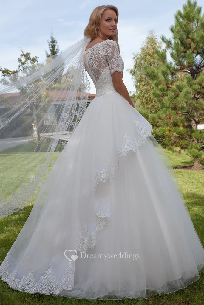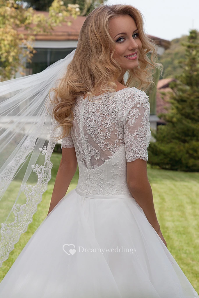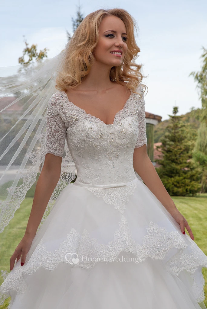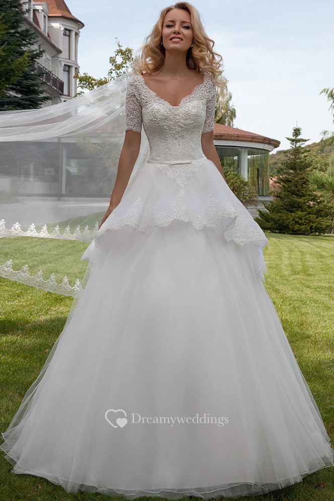 Ball Gown V-Neck Appliqued Short Sleeve Lace Wedding Dress