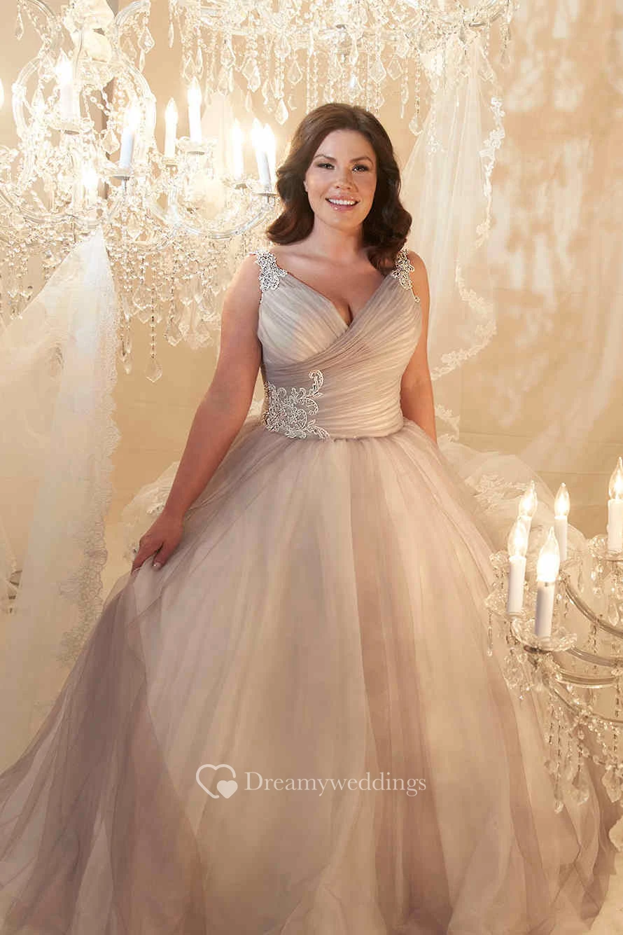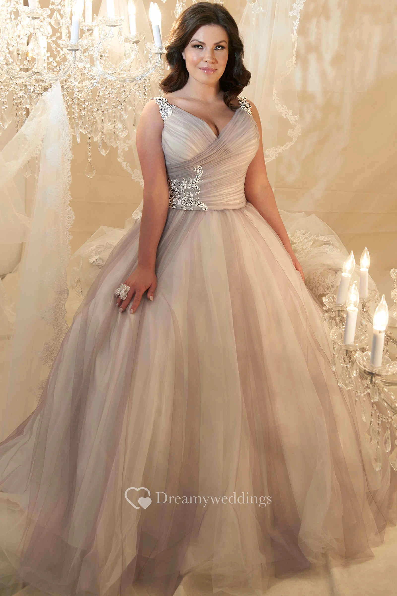 Ball Gown V-Neck Beaded Sleeveless Tulle Plus Size Wedding Dress With Criss Cross And Lace Up