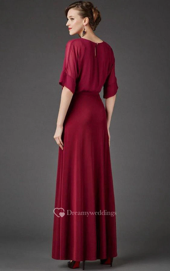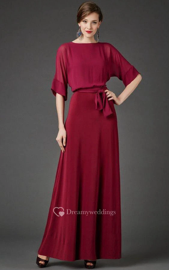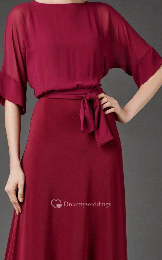 Bateau Bat Half Sleeve A-line Pleated Chiffon Long Dress With Sash