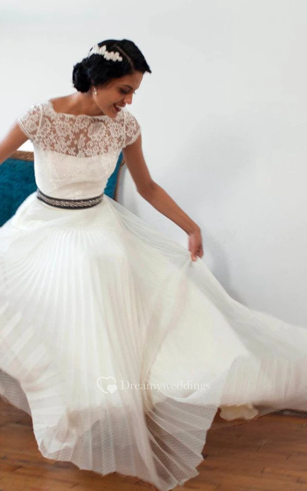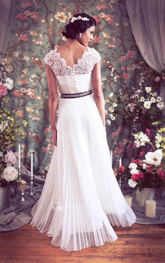 Bateau Cap Button Back Chiffon Wedding Dress With Sash And Pleats