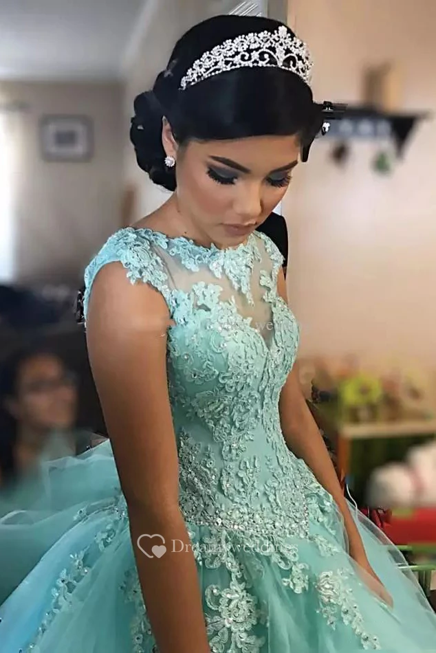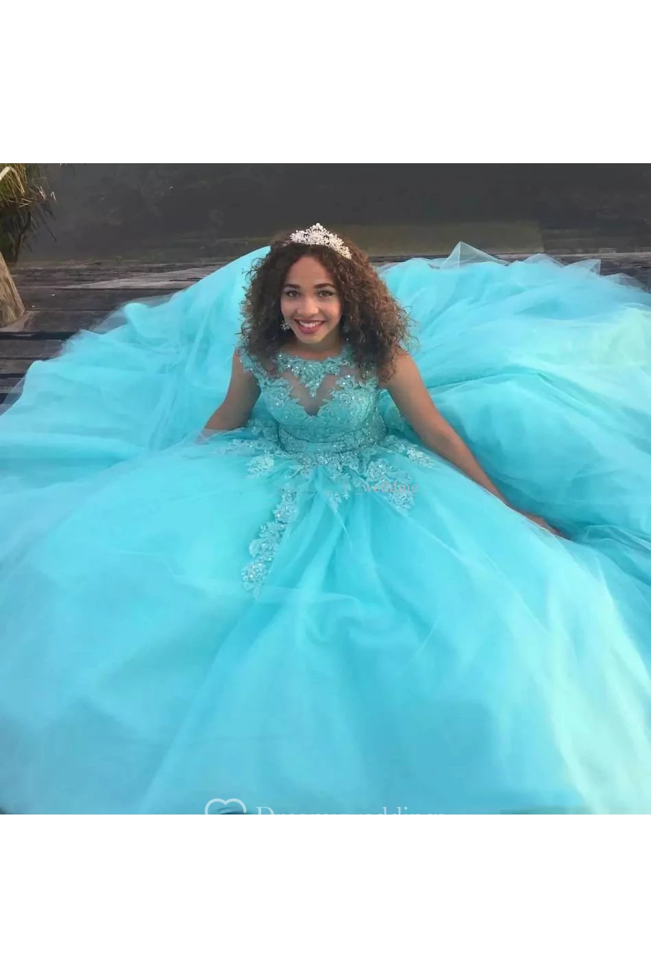 Bateau Cap Short Sleeve Brush Train Lace Tulle Ball Gown Dress