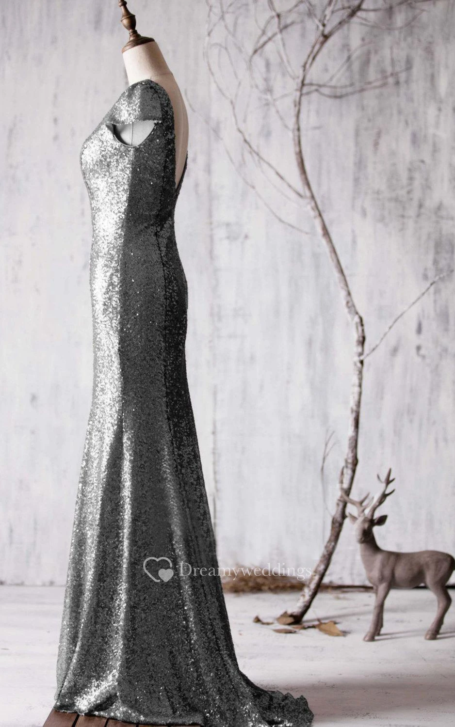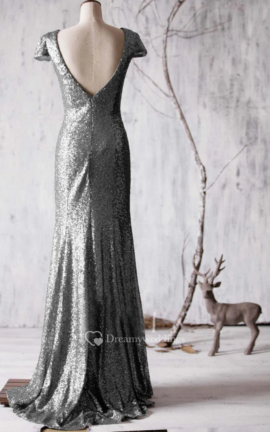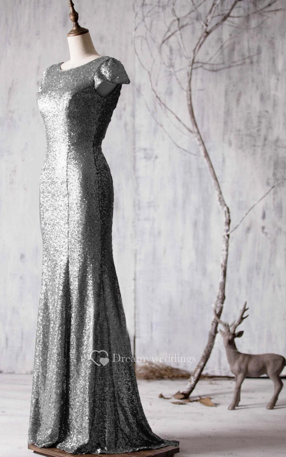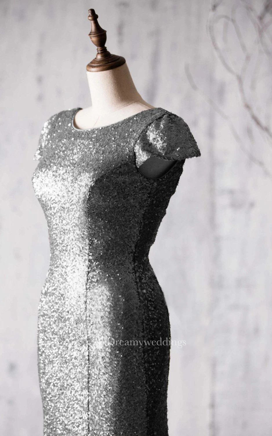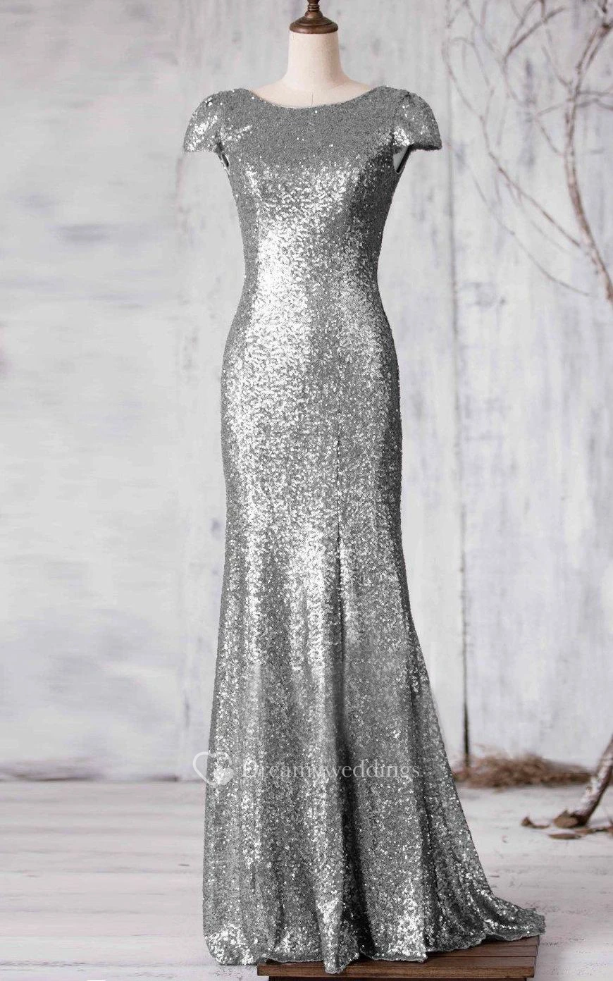 Bateau Cap Sleeve Allover Sequined Mermaid Long Dress Brush Train