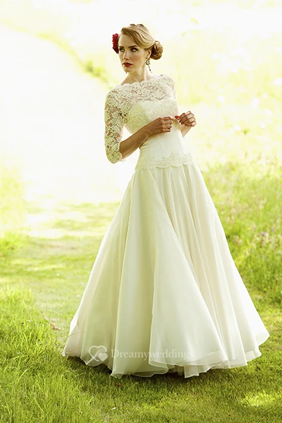 Bateau Floor-Length Lace 3-4-Sleeve Chiffon Wedding Dress