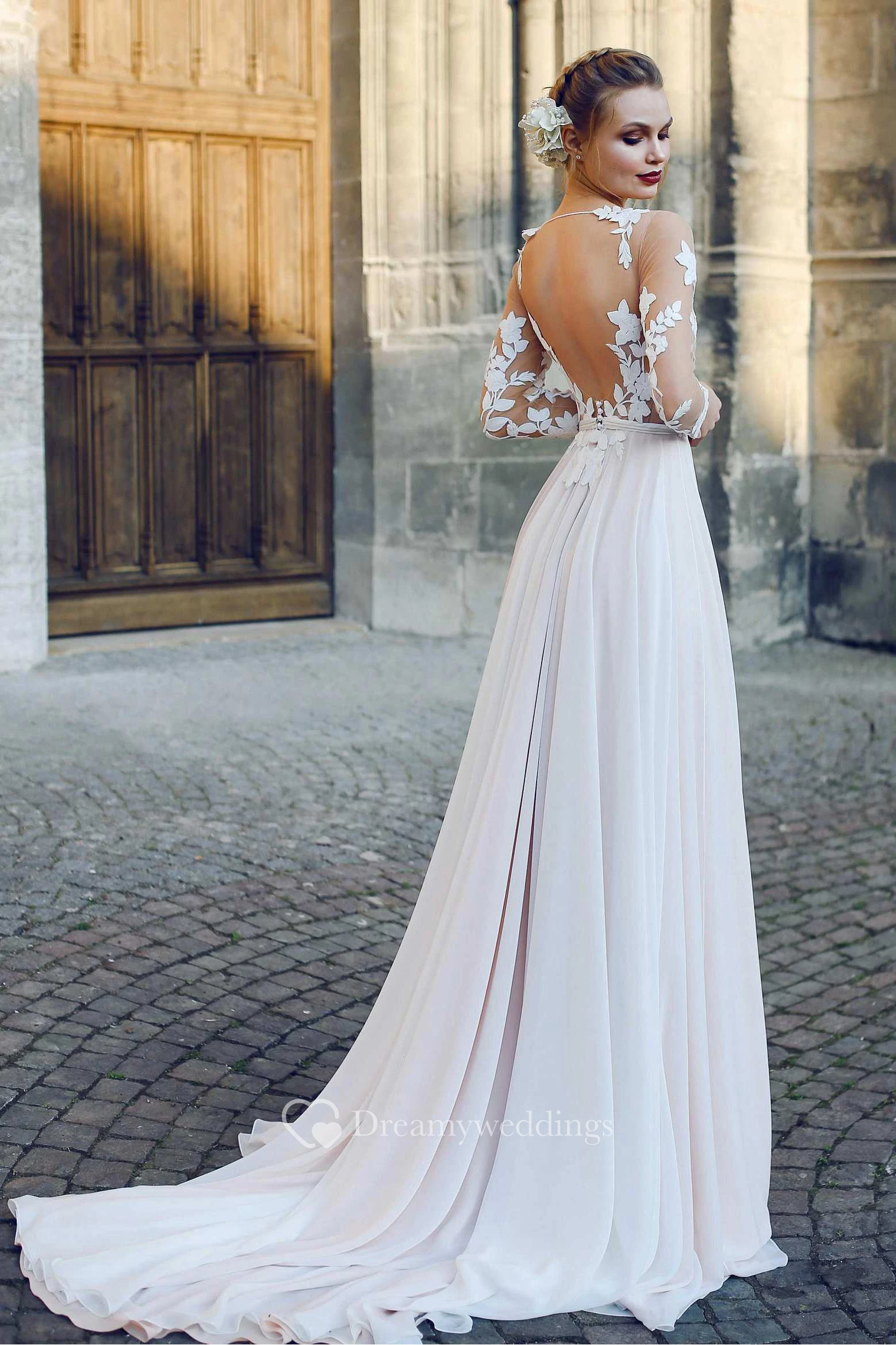 Bateau Illusion Long Sleeve Appliqued A-Line Chiffon Wedding Dress