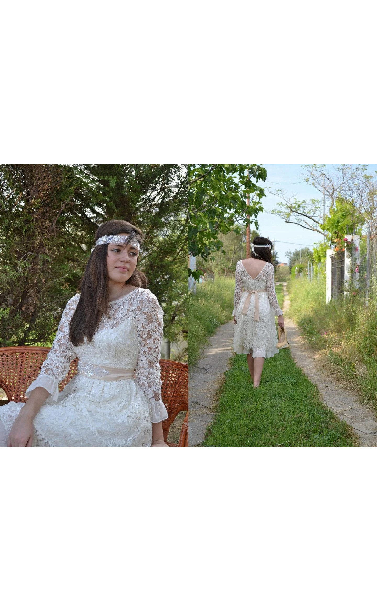 Bateau Illusion Sleeve Deep-V Back Lace Wedding Dress With Sash And Sequins