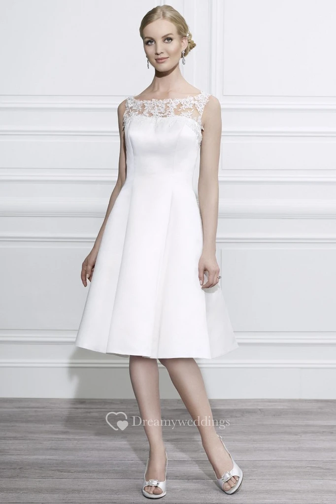 Bateau Knee-Length Appliqued Satin Wedding Dress With Illusion
