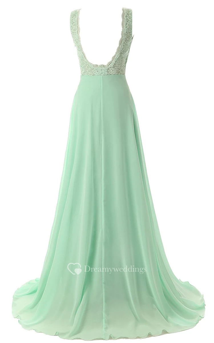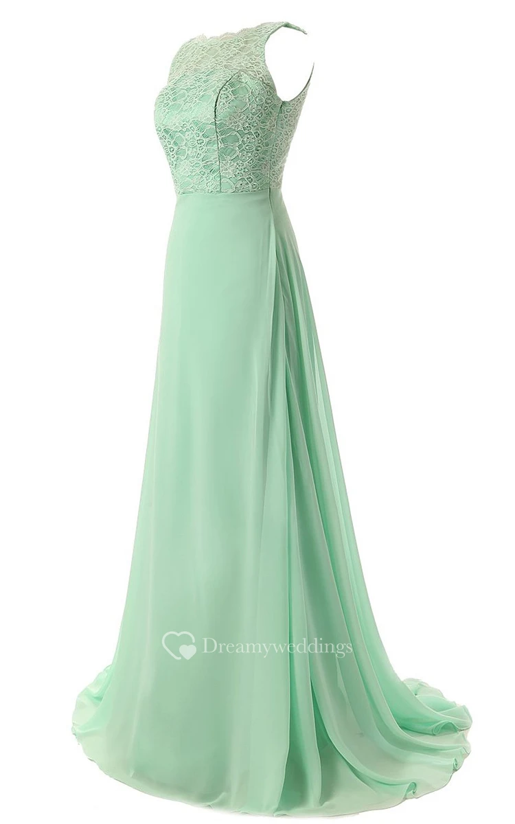 Bateau Lace Bodice Backless Sweep Train