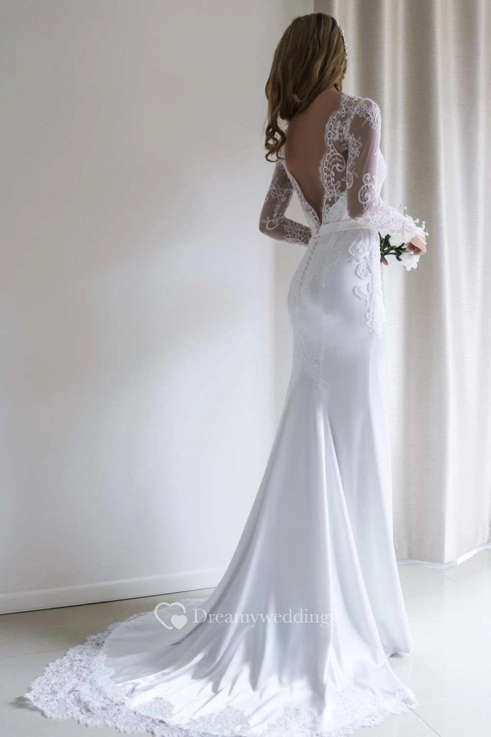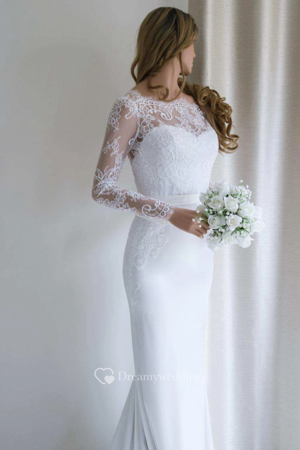 Bateau Lace Long Sleeve Sheath Chiffon Wedding Dress With Sweep Train