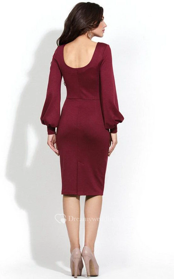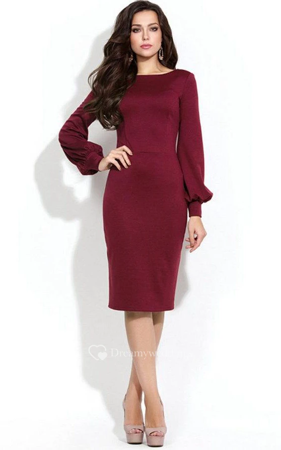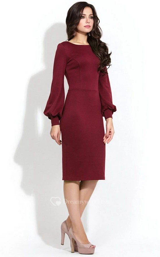 Bateau Long Puff Sleeve Sheath Jersey Knee Length Dress With U Back