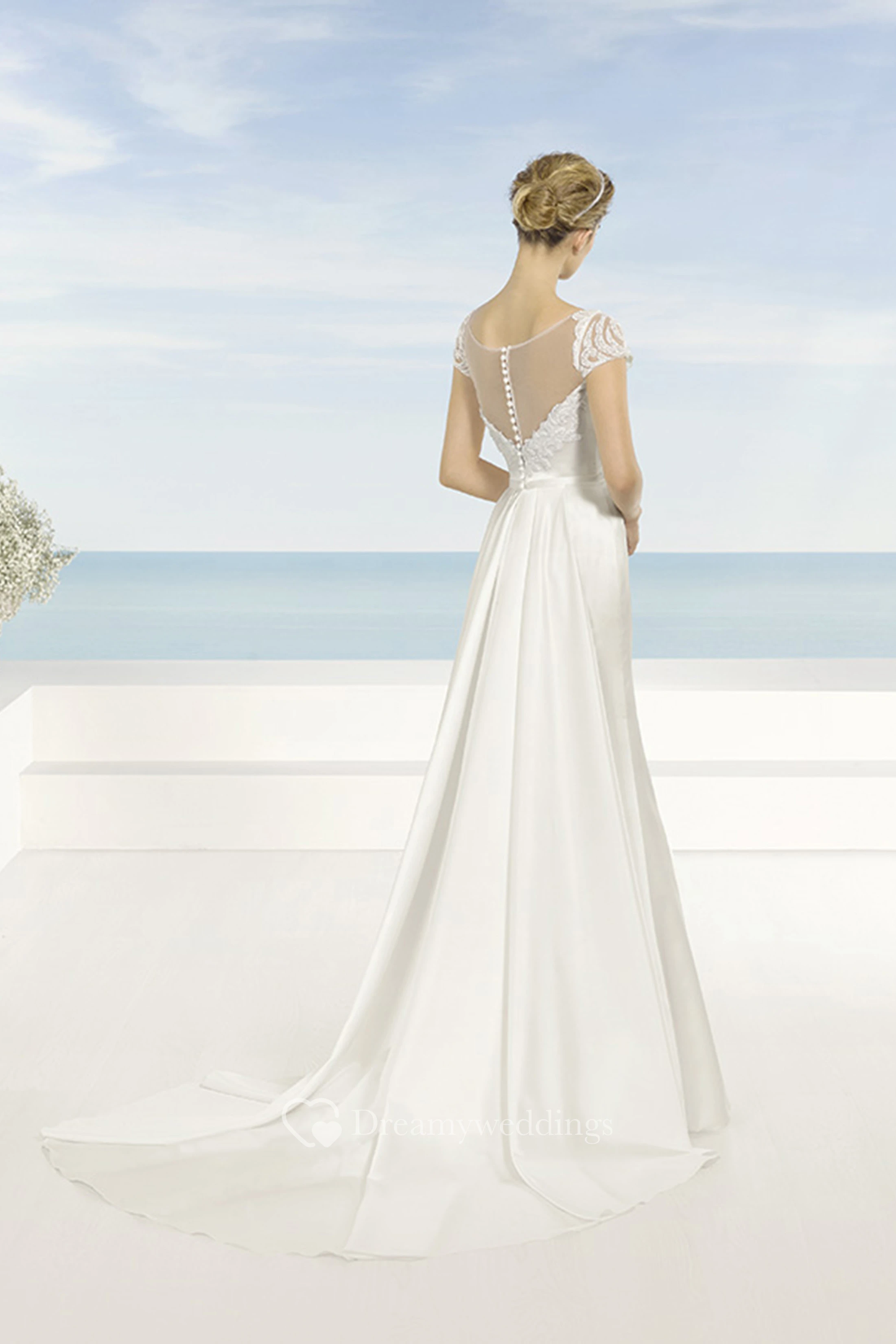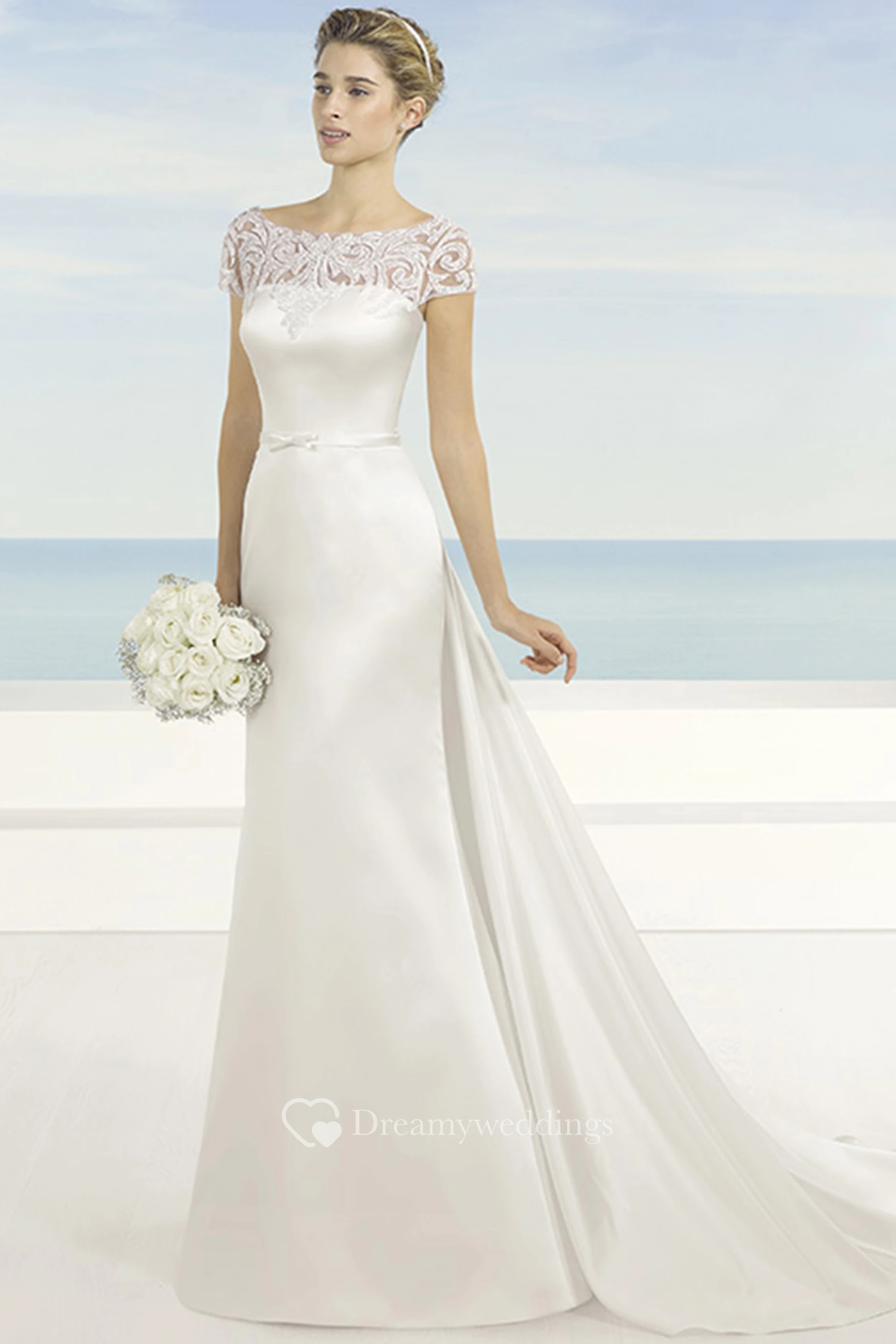 Bateau Long Short-Sleeve Appliqued Satin Wedding Dress