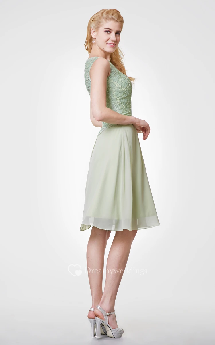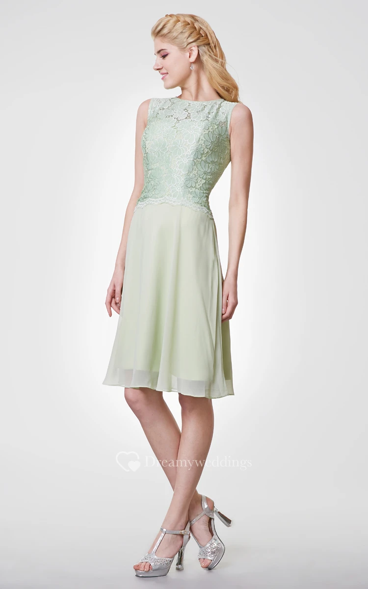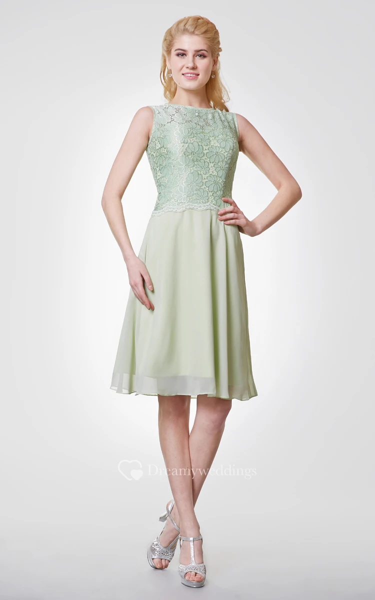Bateau Neck A-line Chiffon Knee Length Dress With Lace Bodice