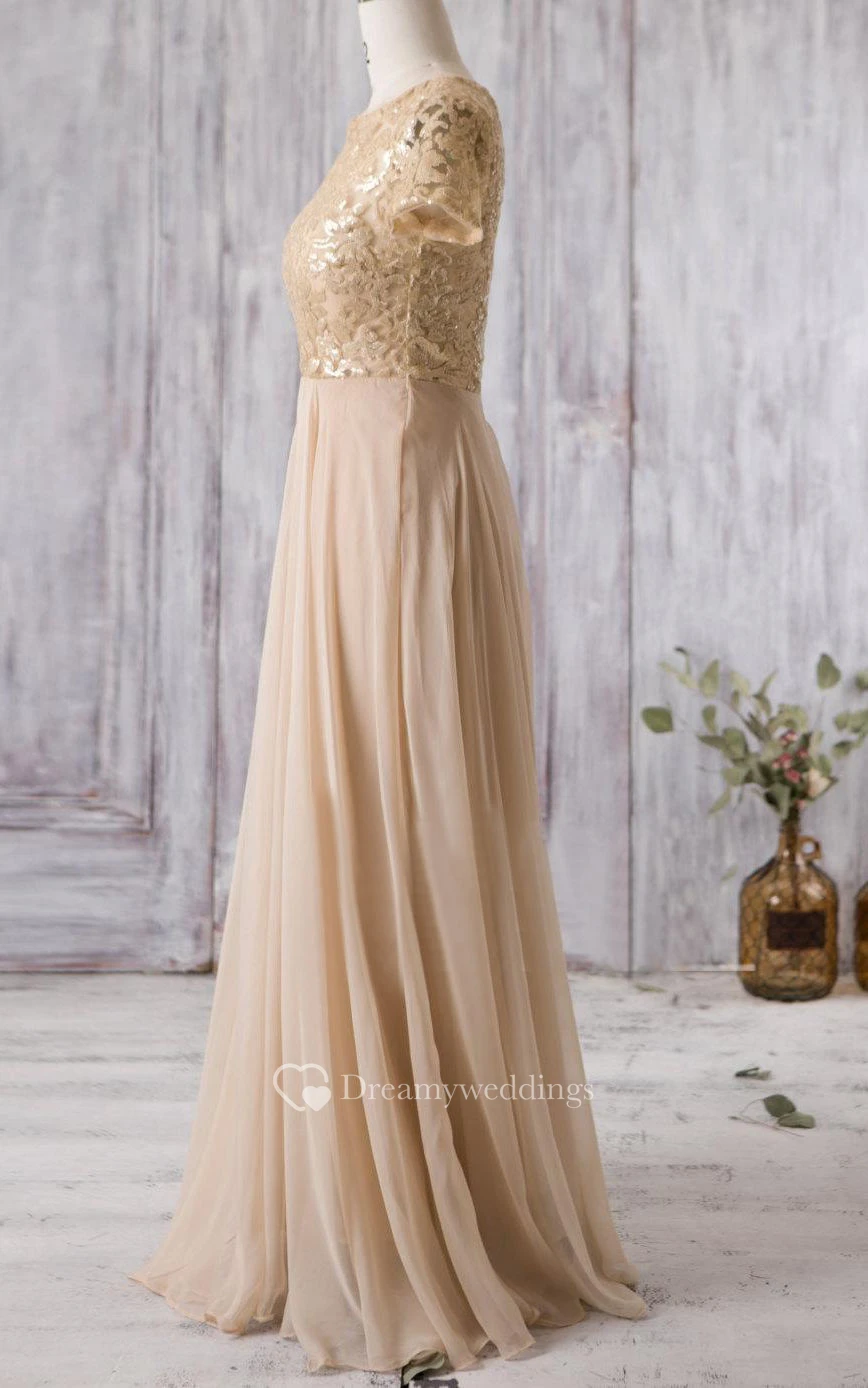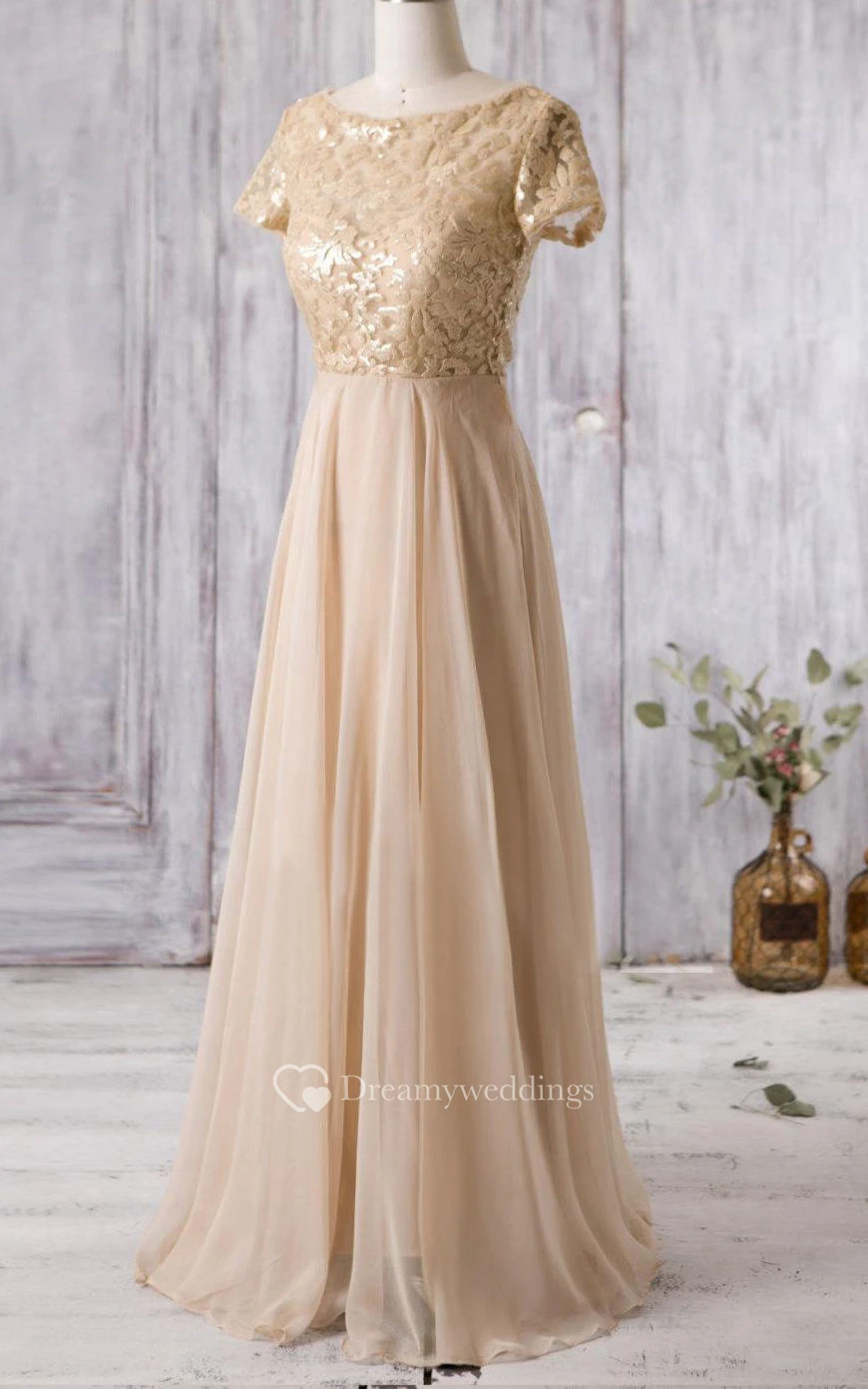 Bateau Neck A-line Pleated Chiffon Long Dress With Lace Bodice