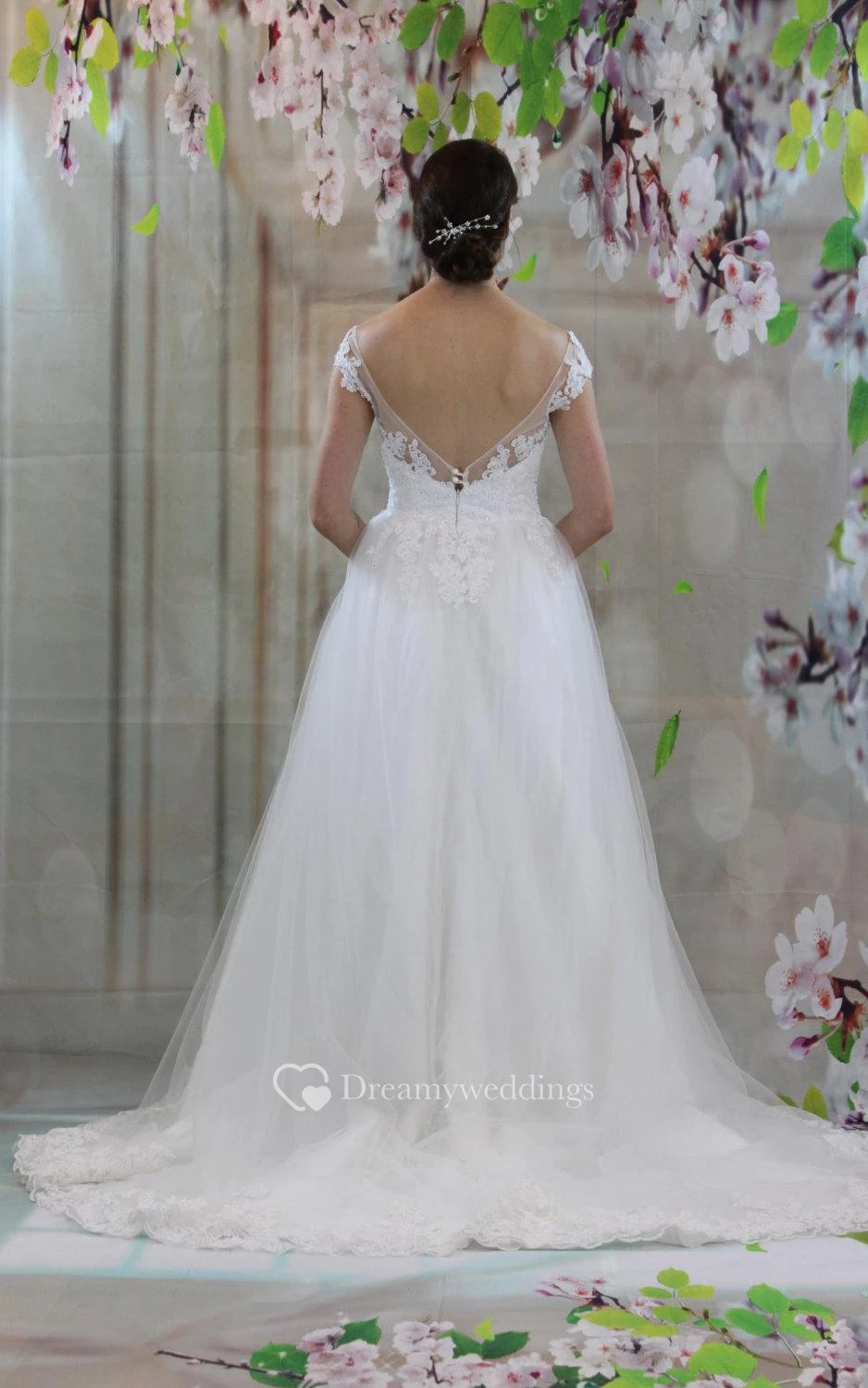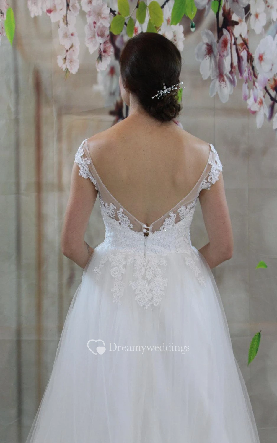 Bateau Neck Cap Sleeve A-Line Lace and Tulle Dress With Low-V Back