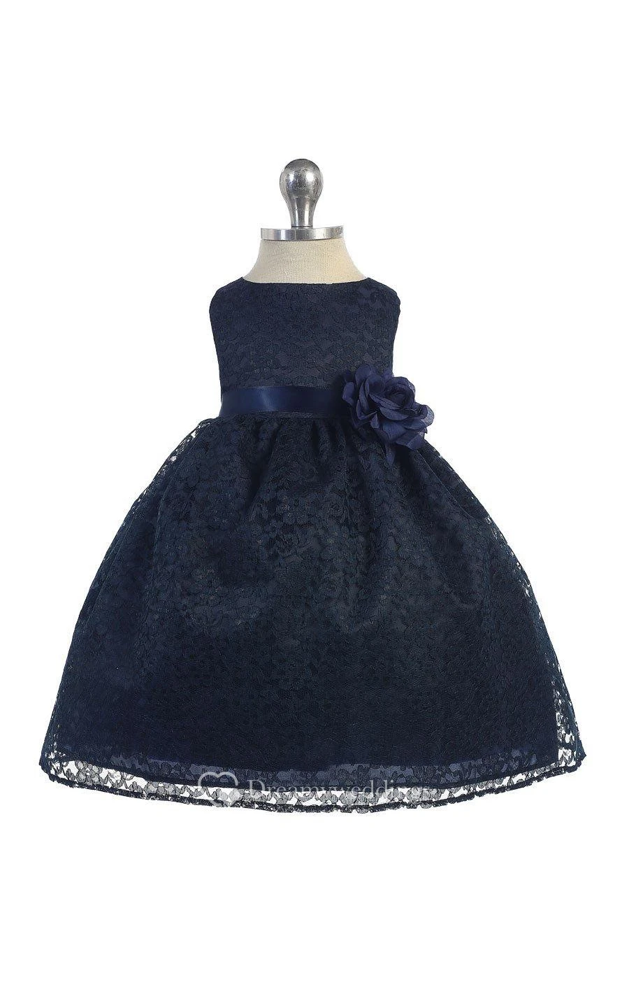Bateau Neck Sleeveless Pleated Lace Ball Gown With Flower and Bow