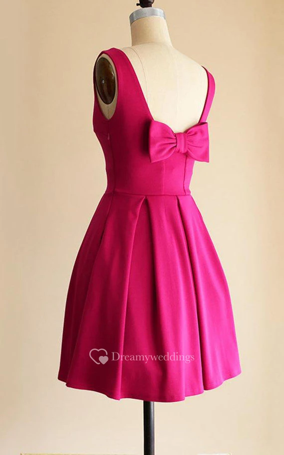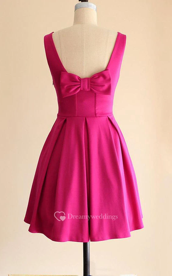 Bateau Sleeveless A-line Pleated Satin Knee Length Dress With Bow