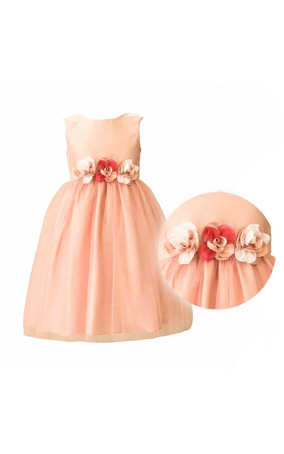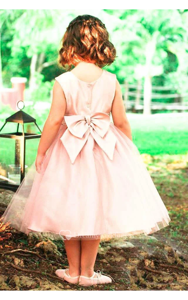 Bateau Sleeveless Pleated A-line Tulle Tea Length Dress With Flower Sash