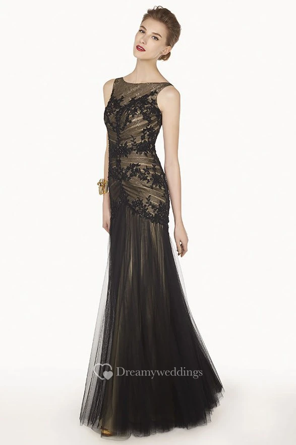 Bateau Sleeveless Tulle Long Prom Dress With Appliqued Top