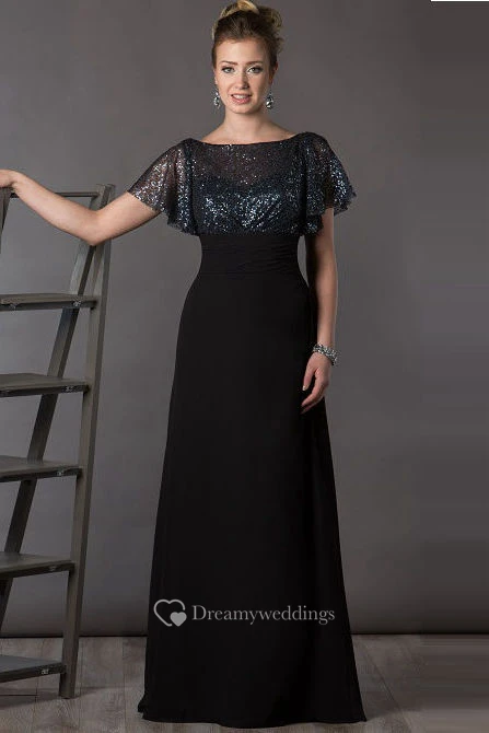 Bateau V Back Sequin Top Chiffon Long Mother Of The Bride Dress With Short Batwing Sleeve