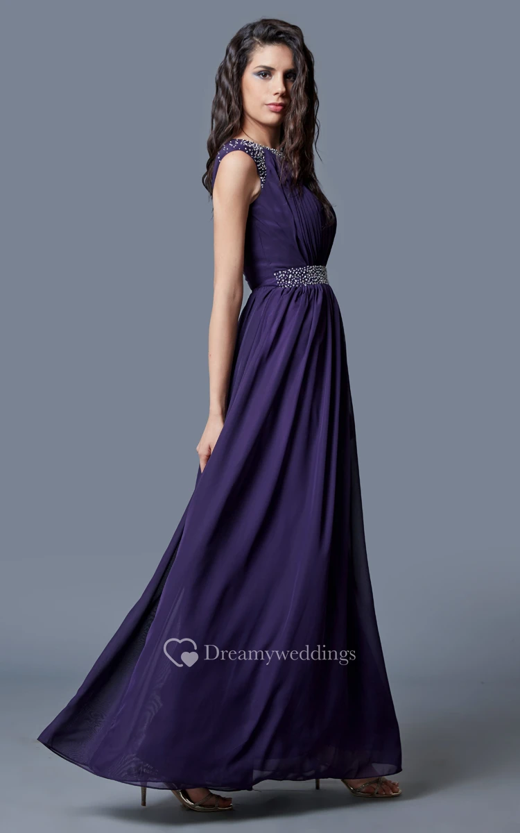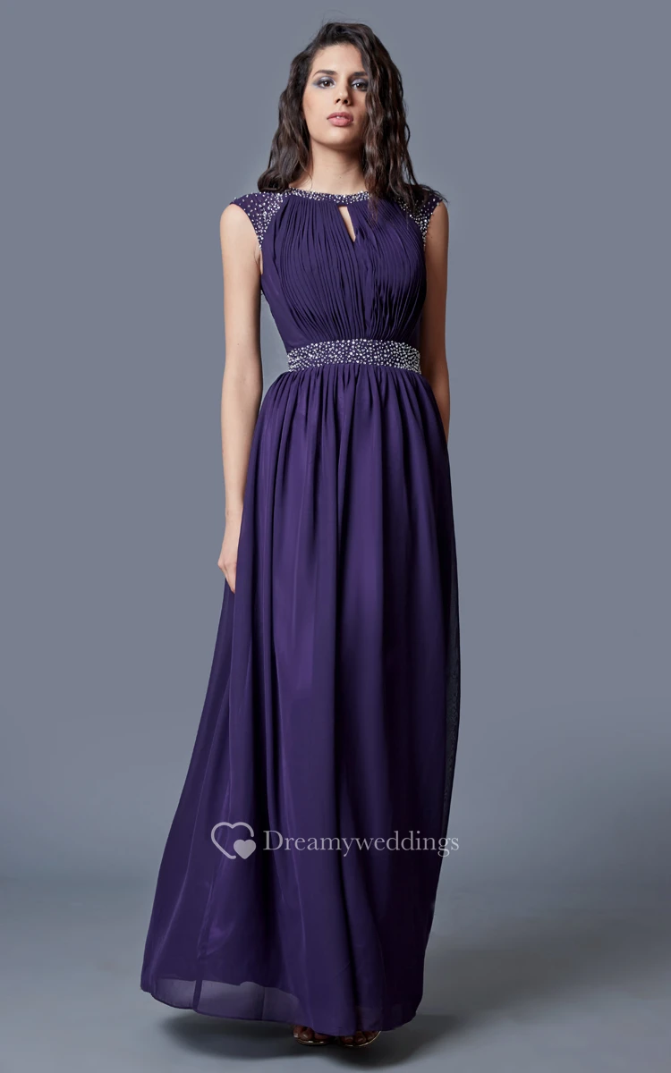 Beaded Cap-sleeved Bateau Neck Ruched Long Chiffon Dress