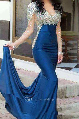 Beaded Illusion Long Sleeve Mermaid Jersey Dress