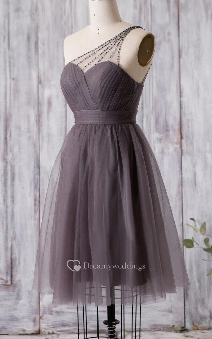 Beaded Single Strap Sweetheart A-line Pleated Tulle Knee Length Dress