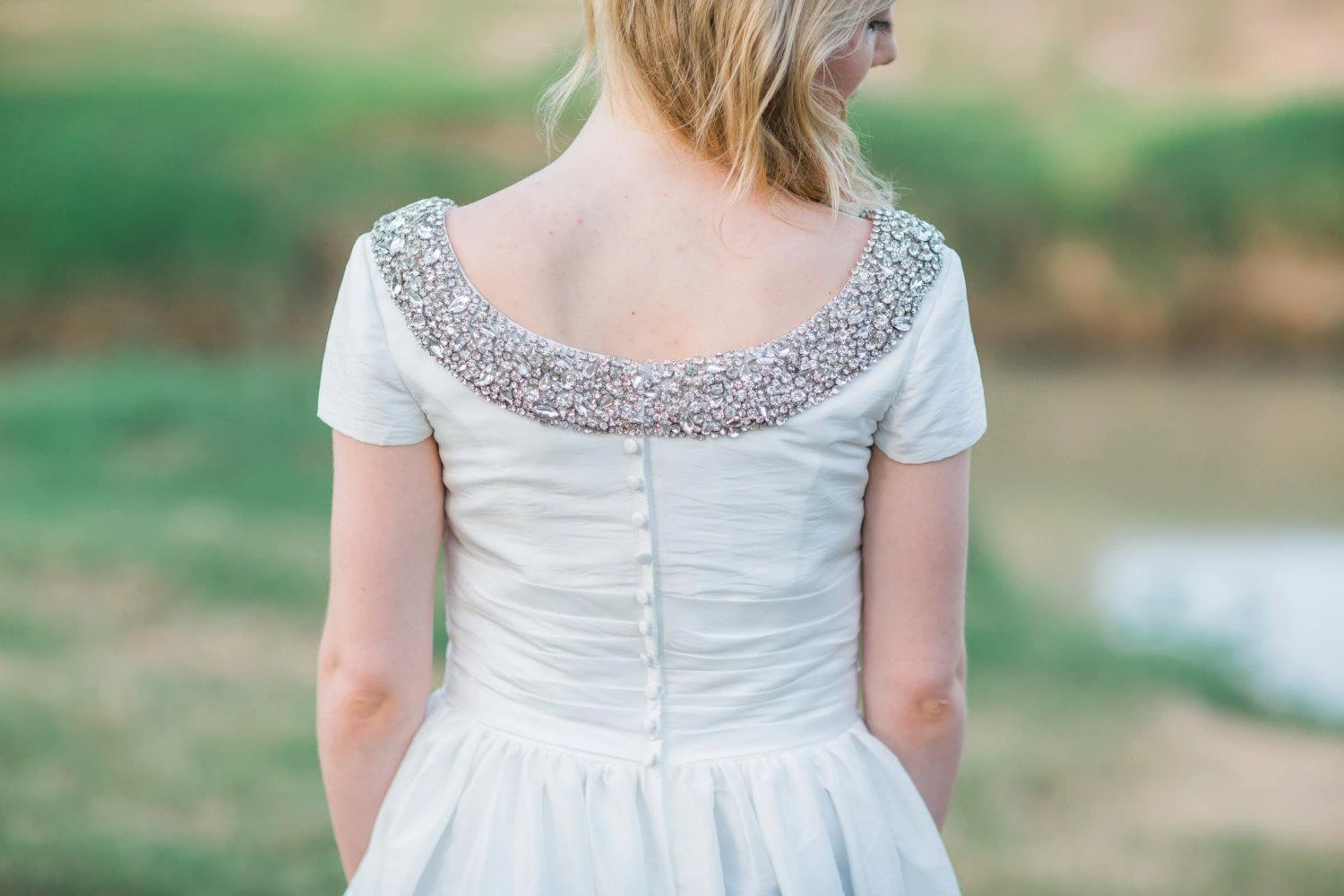 Beaded Square Neckline A-Line Short Sleeve Taffeta Gown With Waist Band
