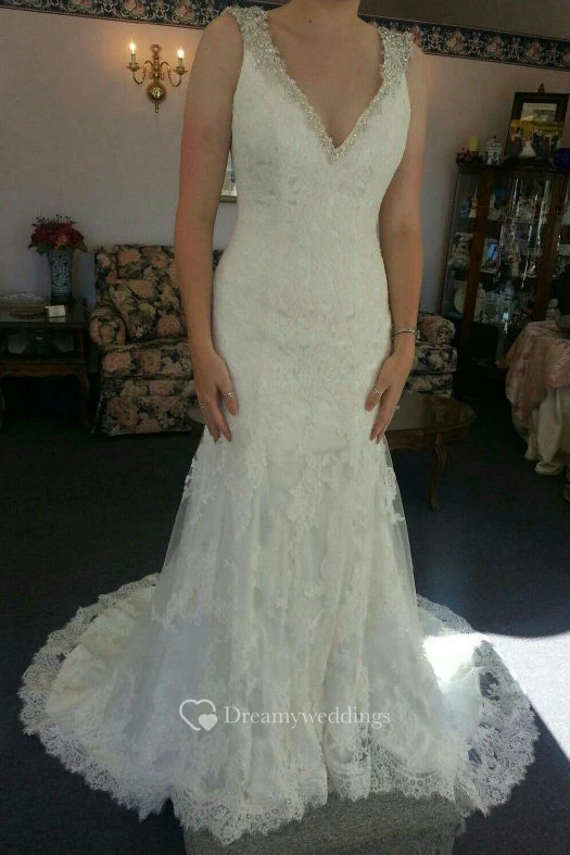 Beading V Neckline Sheath Allover Lace Wedding Gown With Straps