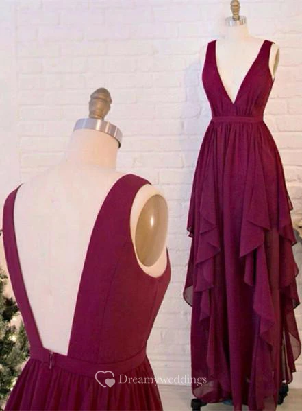Beautiful Burgundy V-Neck Long Prom Dresses Chiffon Floor Length