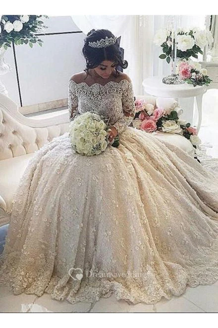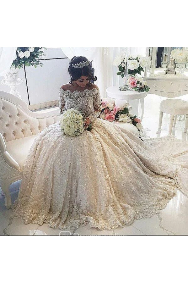 Beautiful Lace Long Sleeve Princess Wedding Dresses Ball Gown With Appliques