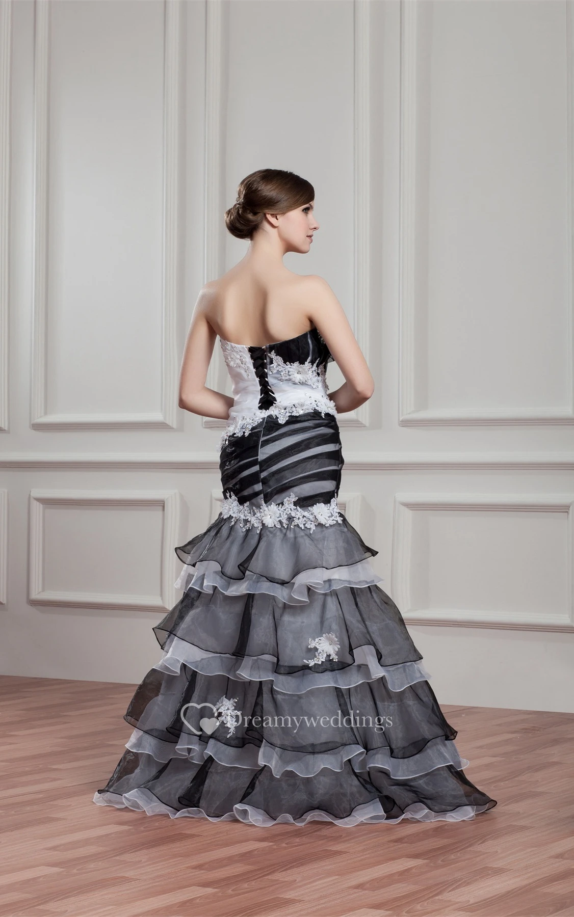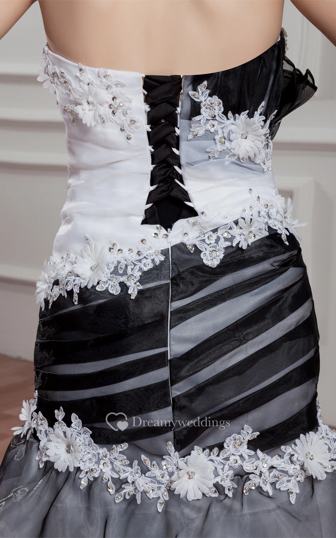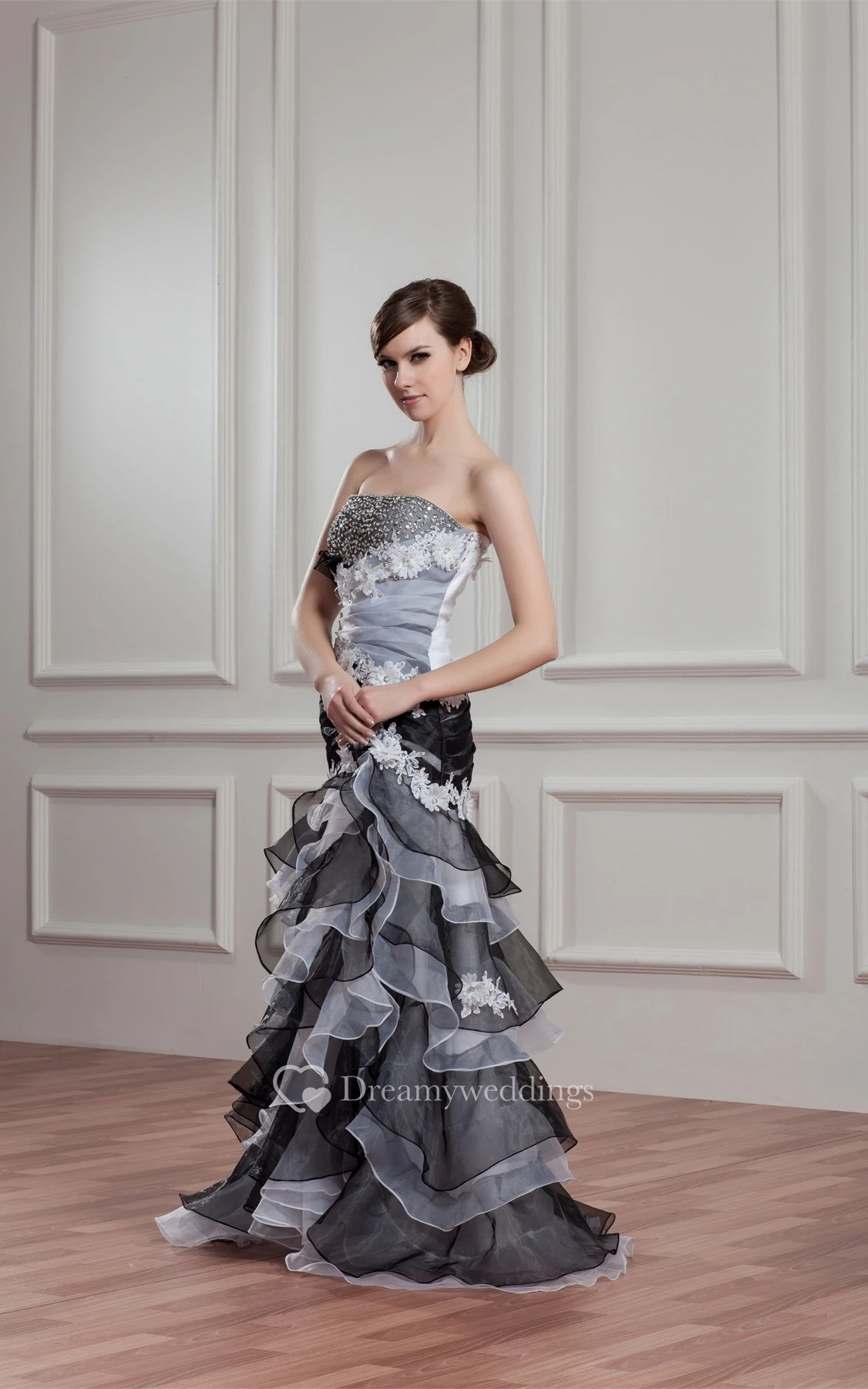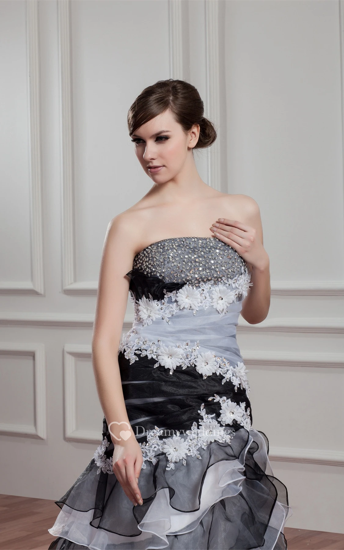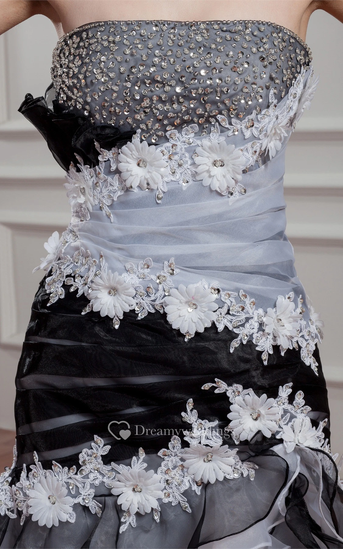 Black-And-White A-Line Tiered Rhinestone and Gown With Flower