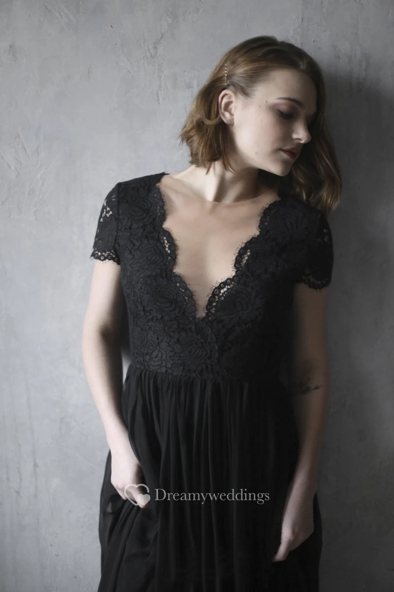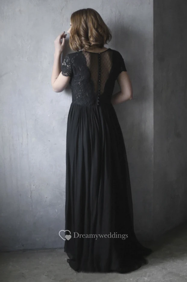 Black Chiffon Wedding Dress With Scalloped V-neck Lace Appliques Short Sleeve And Illusion Back