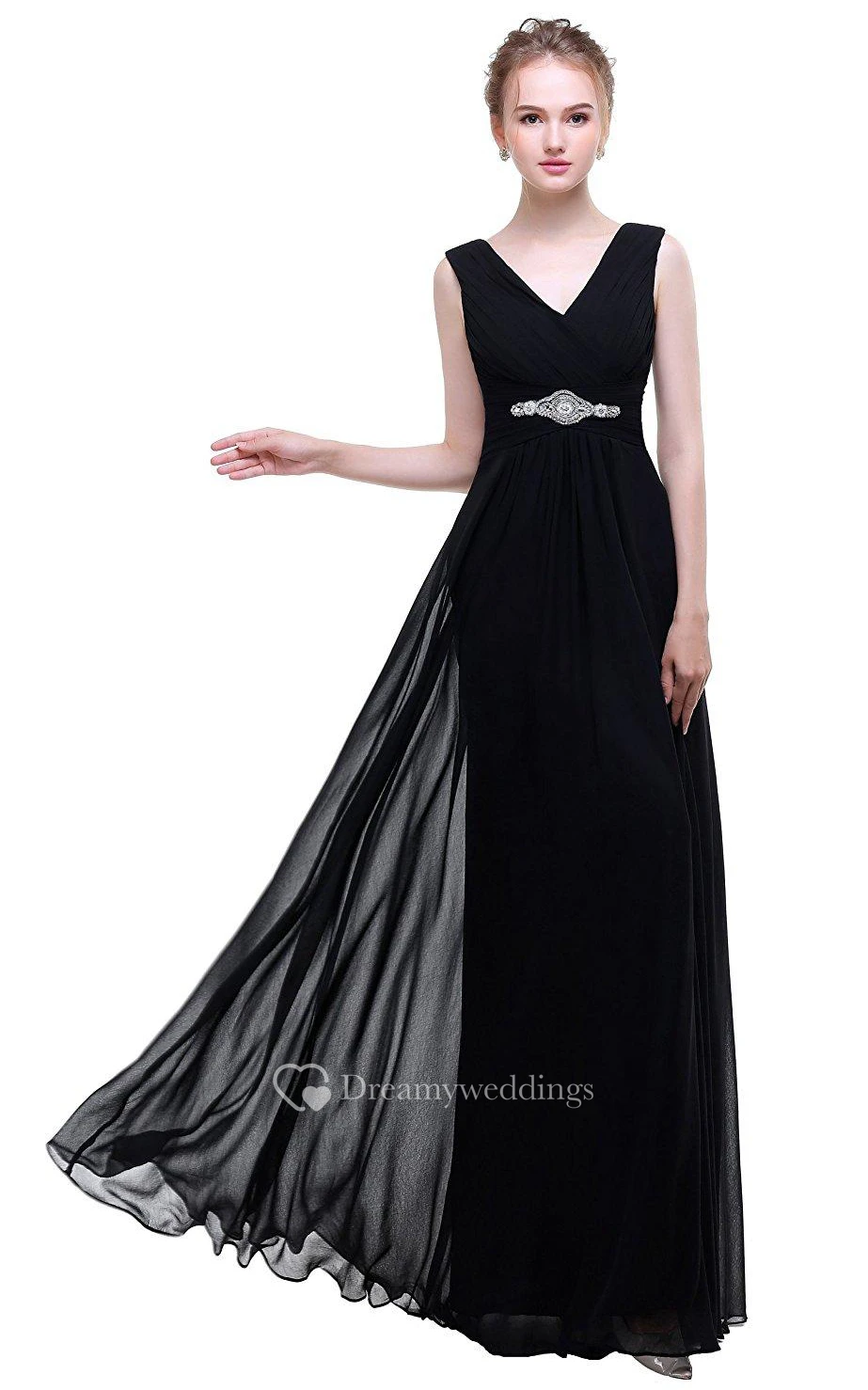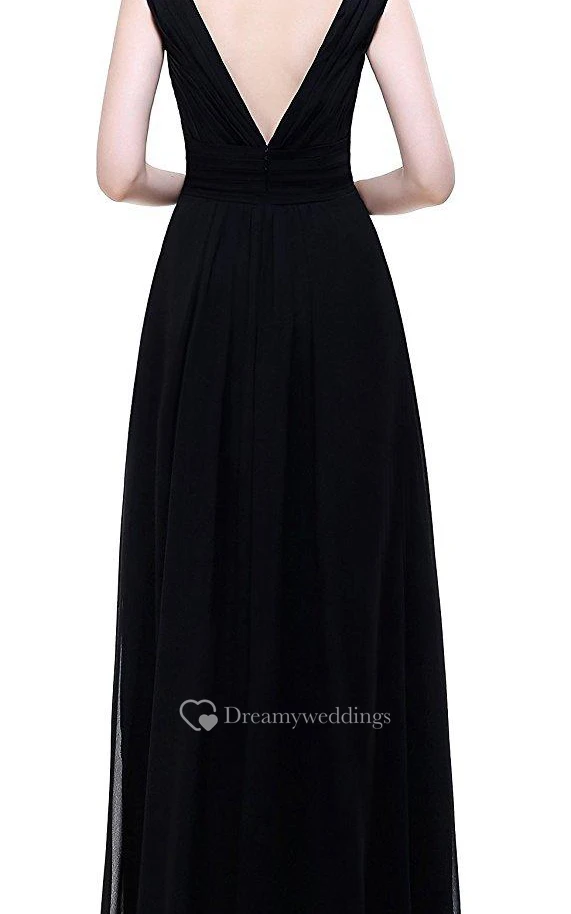 Black Empire V-neck Beaded A-line Chiffon Dress With Low-v Back