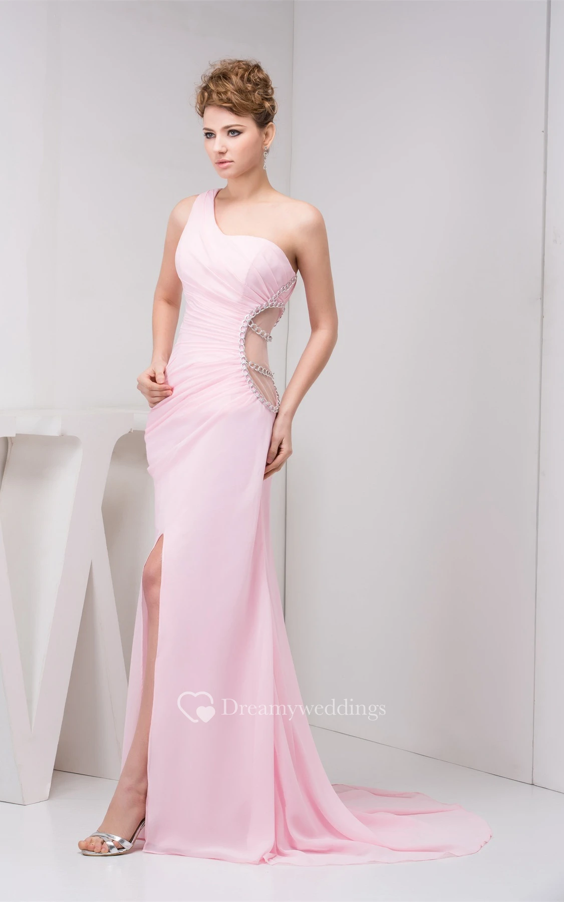 Blushing Front-Split One-Shoulder Sweep Train and Dress With Keyhole