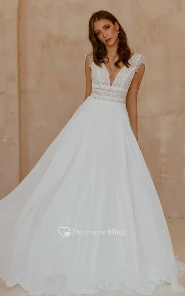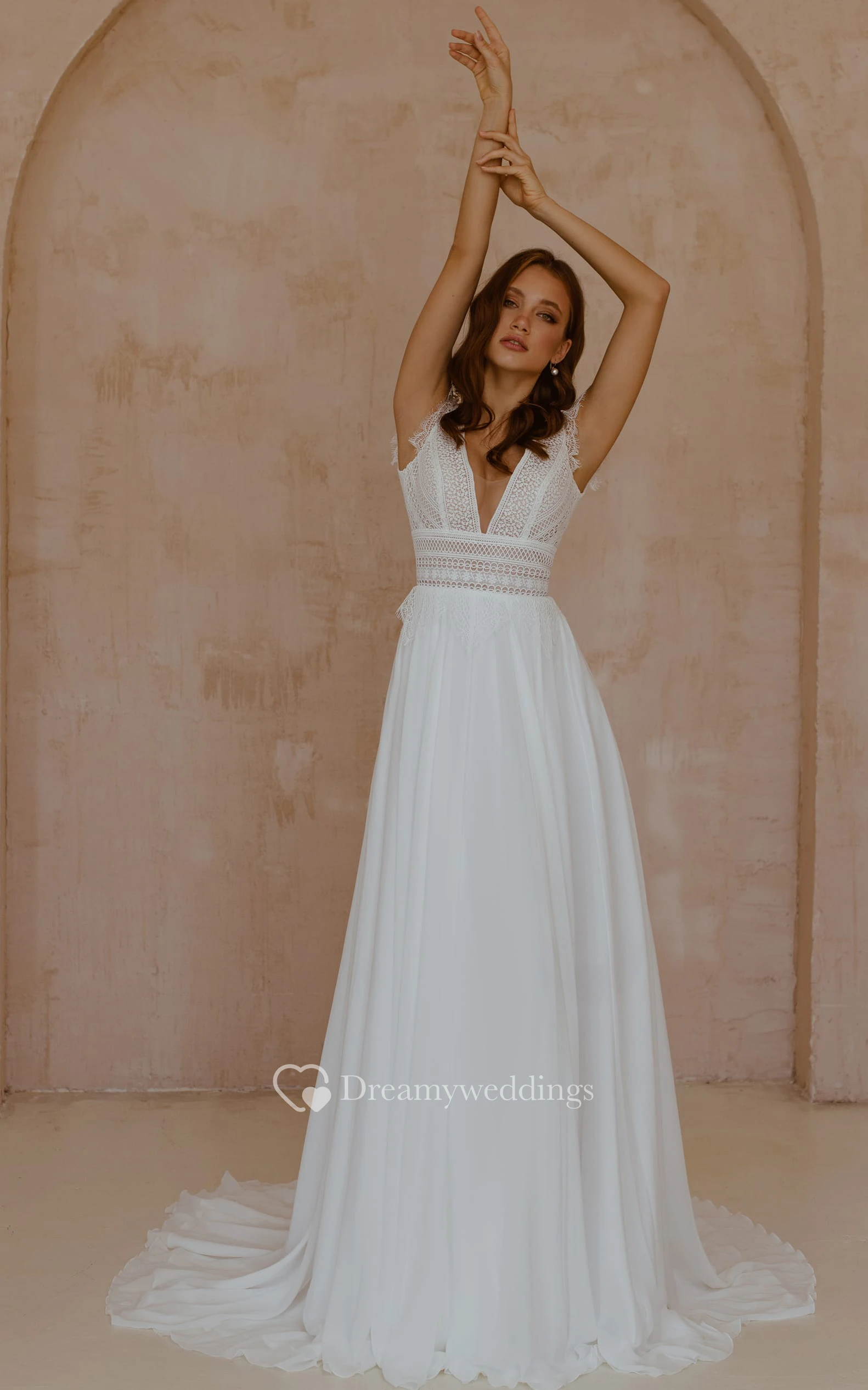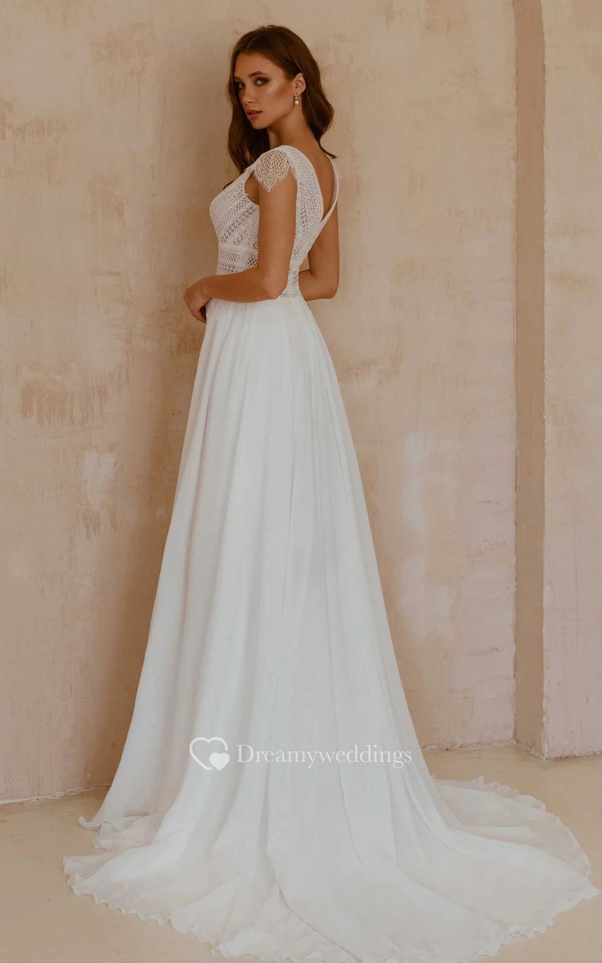 Bohemian V-neck Chiffon Lace A Line Short Sleeve Floor-length Sweep Train Wedding Dress