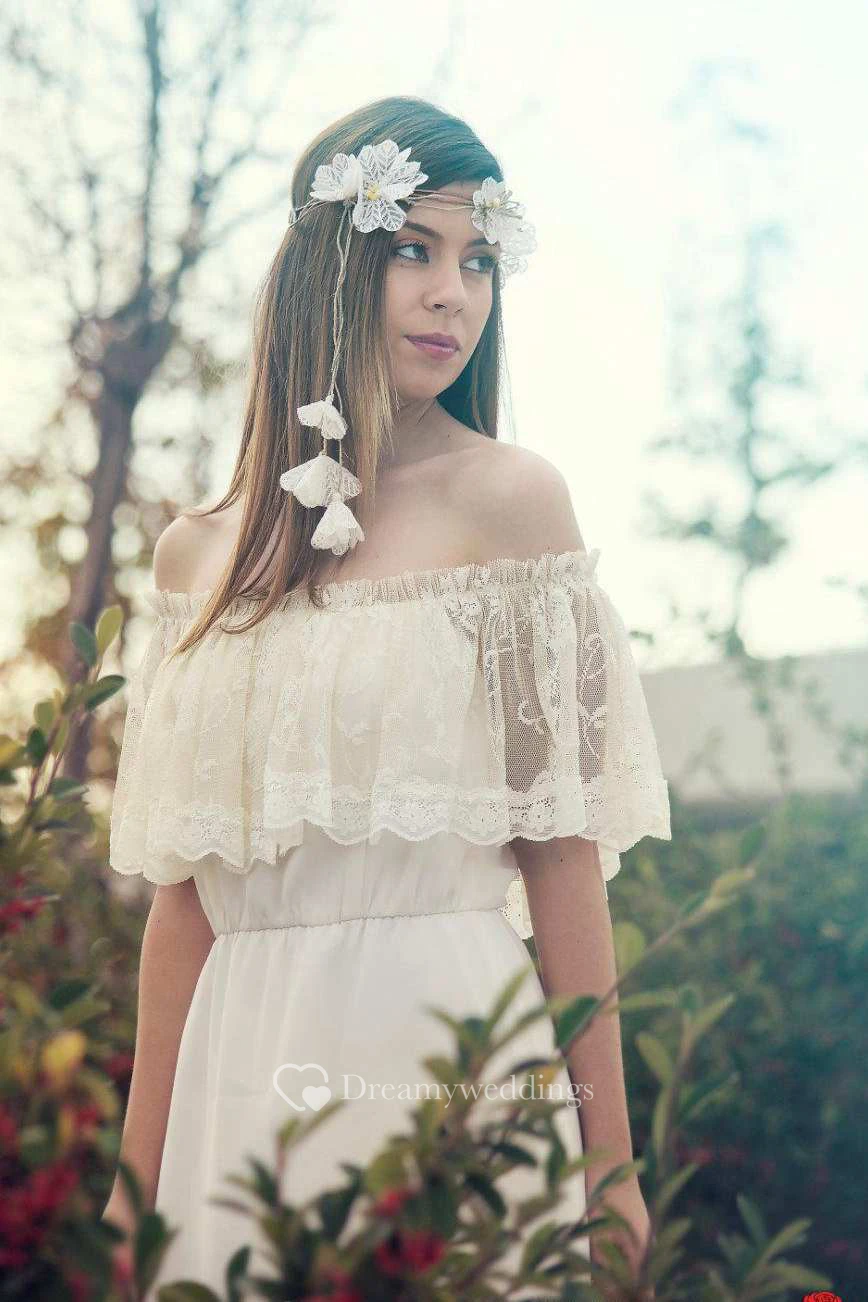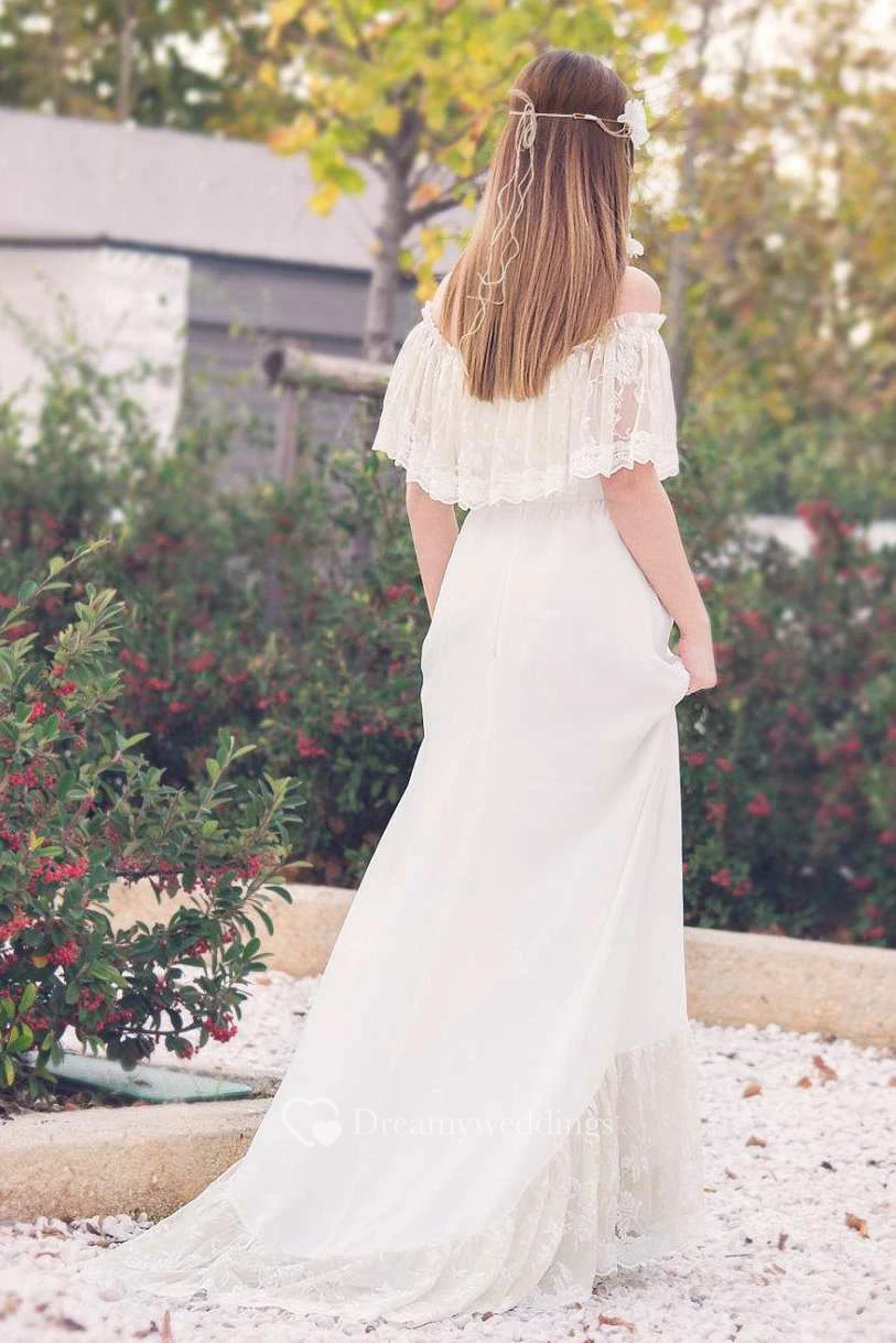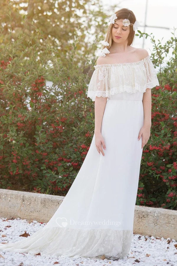 Boho Off-The-Shoulder Lace Chiffon Wedding Dress With Sweep Train