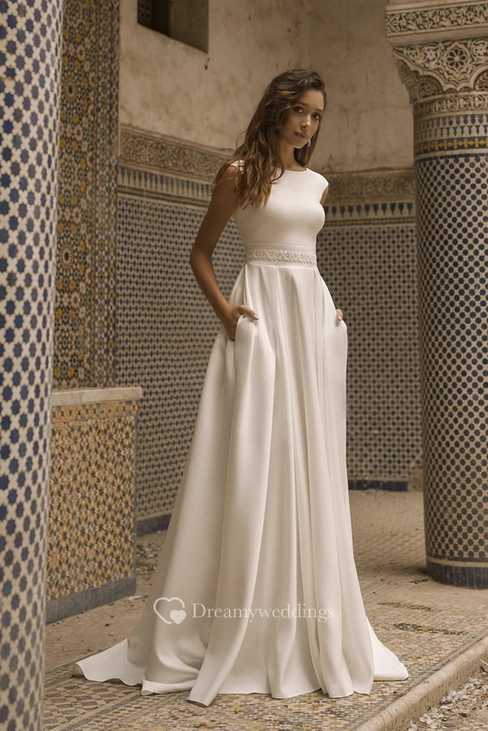 Cap Sleeve Bateau Neckline With Elegant Satin Wedding Dress With V-back And Sash Details