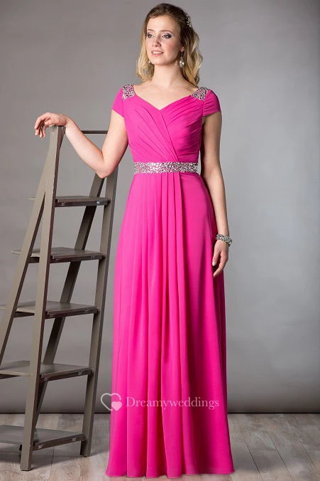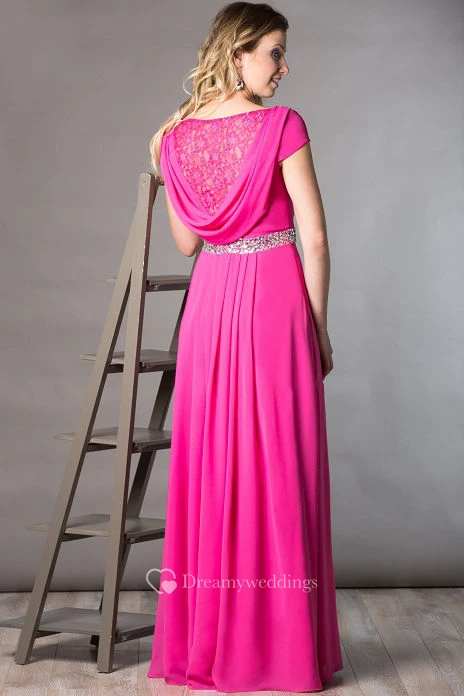 Cap Sleeve Chiffon Long Mother Of The Bride Dress With Crystal Waist And Lace Cowl Back