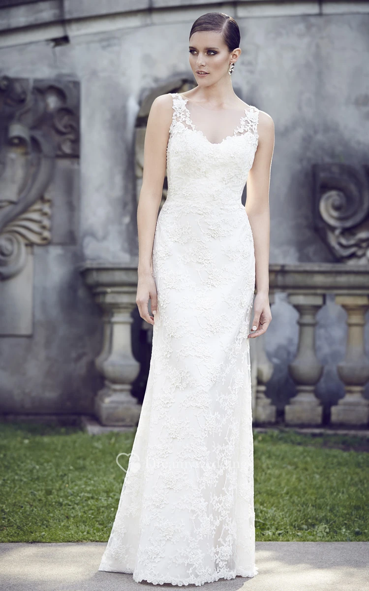 Cap-Sleeve Deep V-Neck Lace Floor-Length Dress