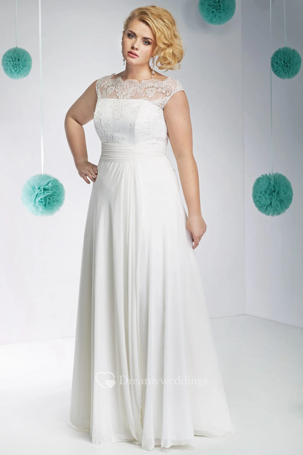 Cap-Sleeve Floor-Length Lace Bateau-Neck Chiffon Plus Size Wedding Dress